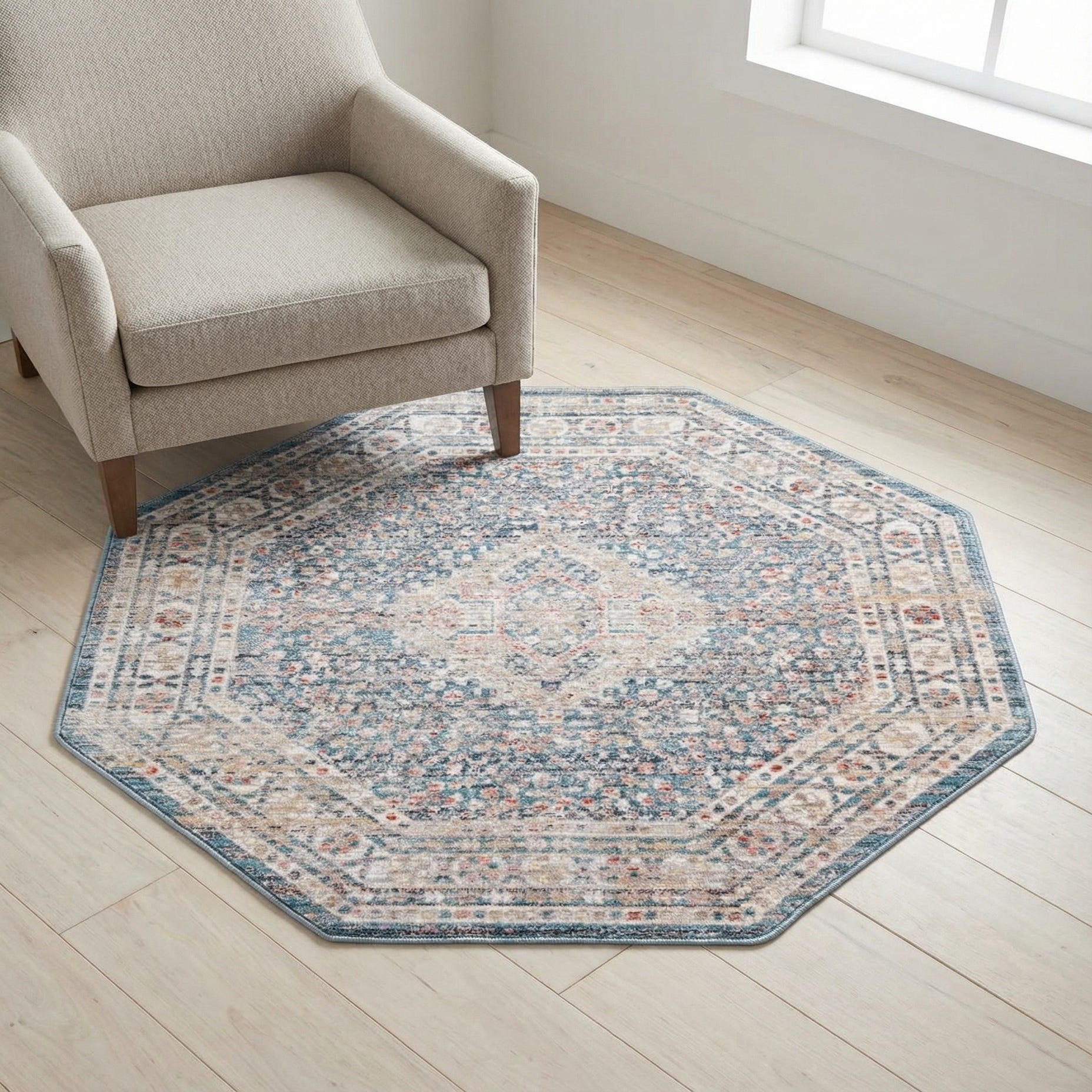 Primary color is Blue. Colors in this rug include: Blue, Beige, Gray, Ivory, Red, Pink.