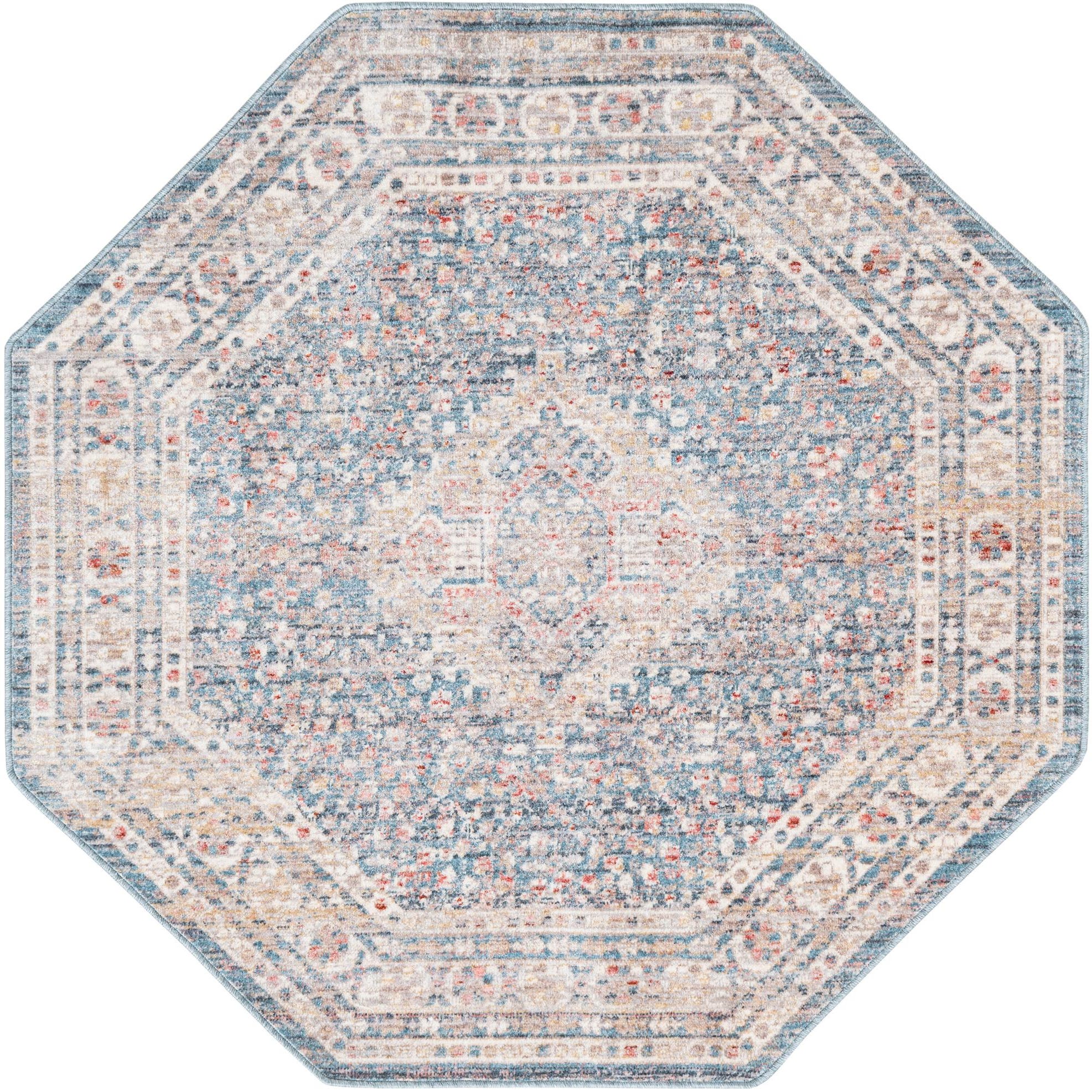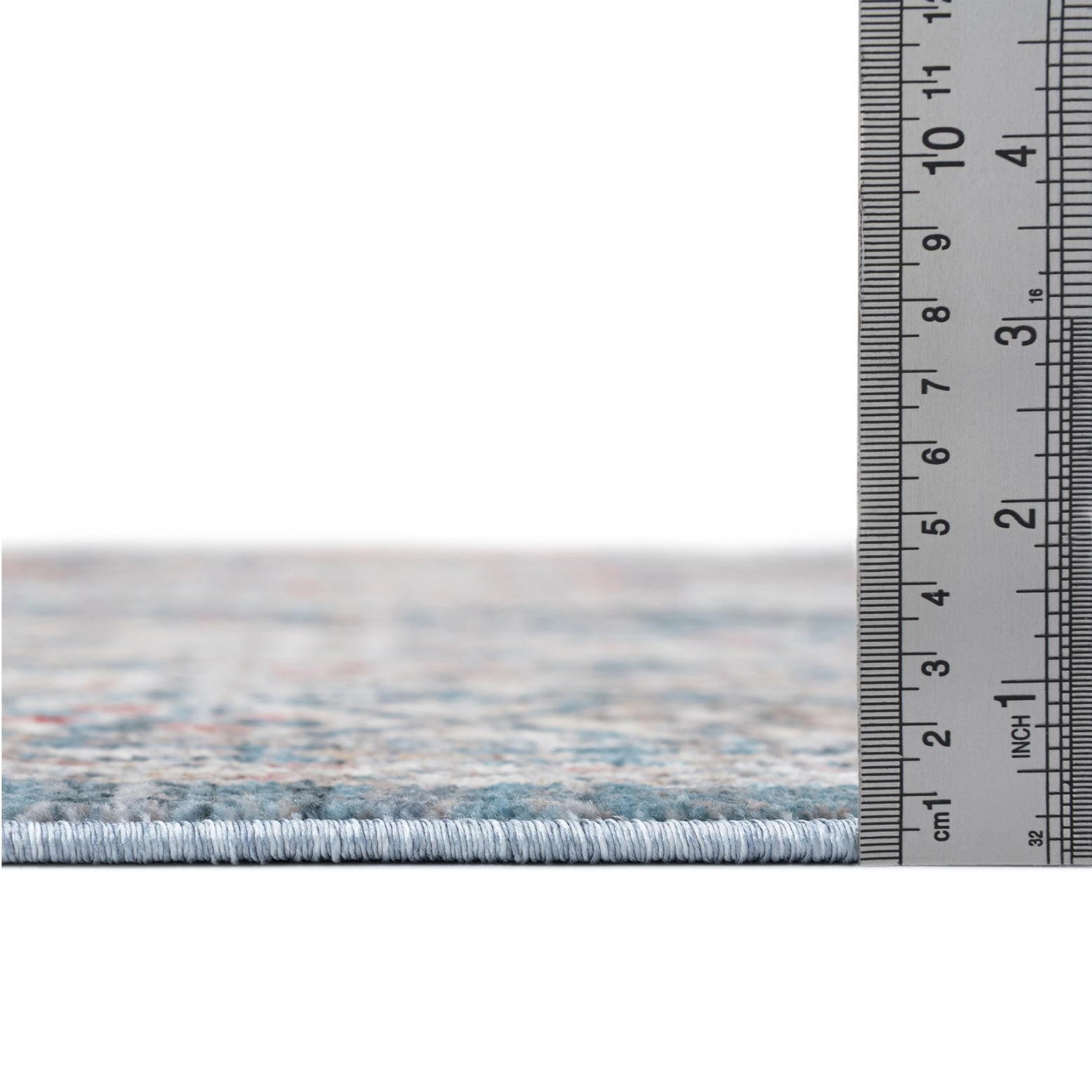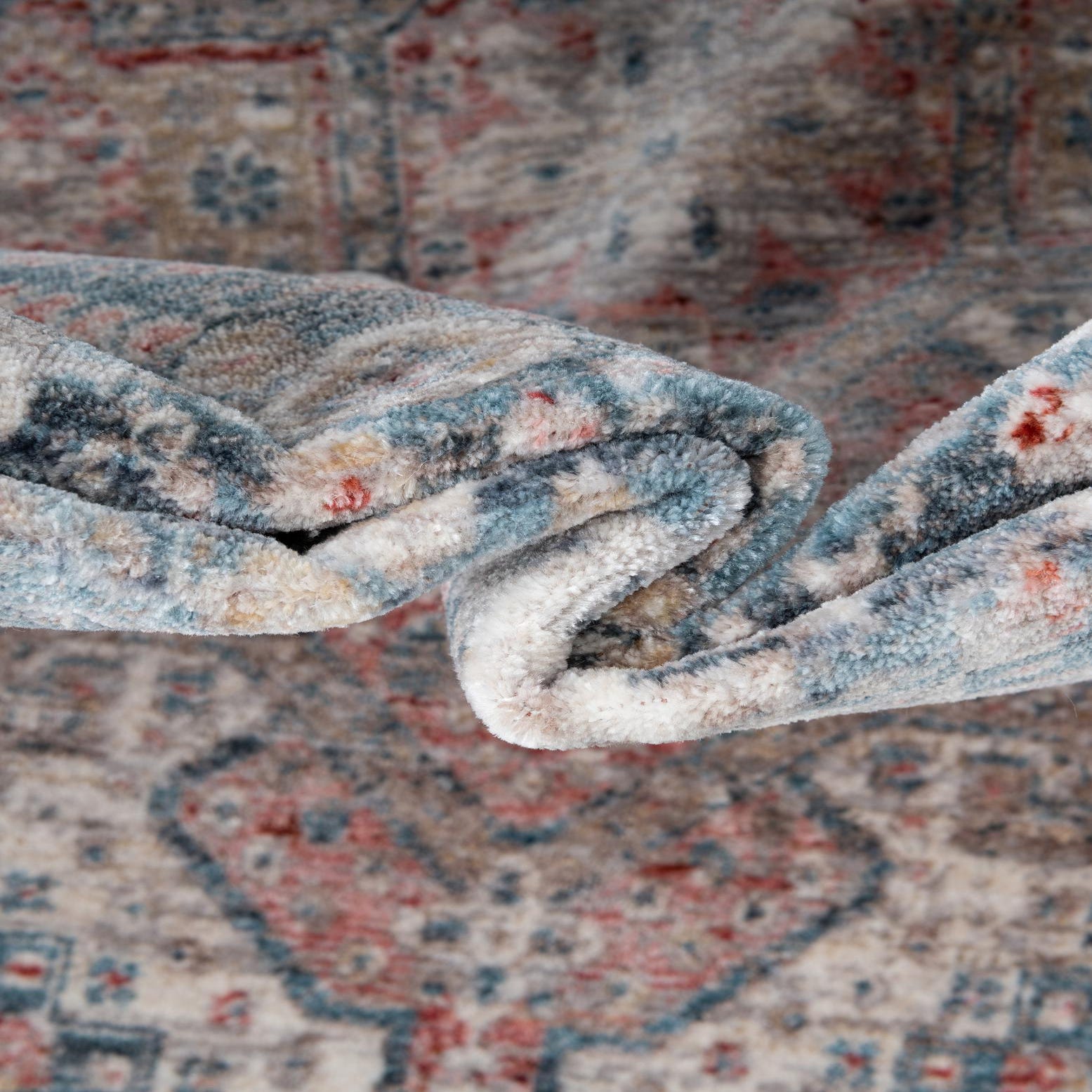 Primary color is Blue. Colors in this rug include: Blue, Beige, Gray, Ivory, Red, Pink.