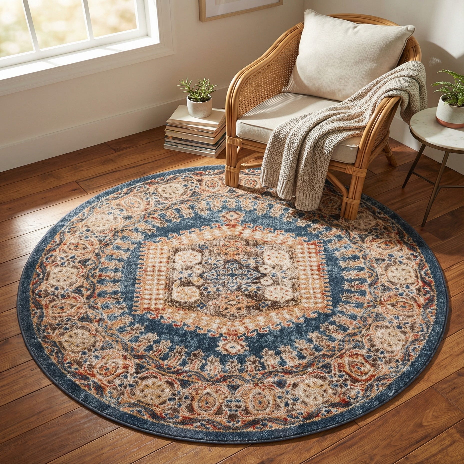 Primary color is Blue. Colors in this rug include: Blue, Beige, Brown, Light Blue, Light Brown, Peach, Gold.