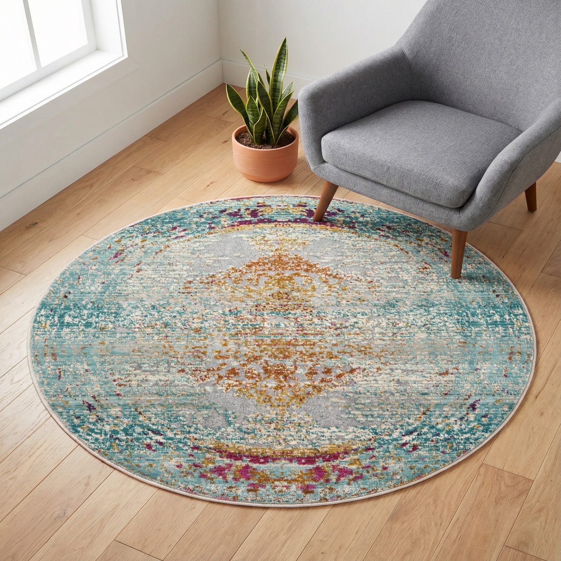 Primary color is Blue. Colors in this rug include: Blue, Gray, Ivory, Orange, Turquoise, Yellow, Violet, Light Blue.