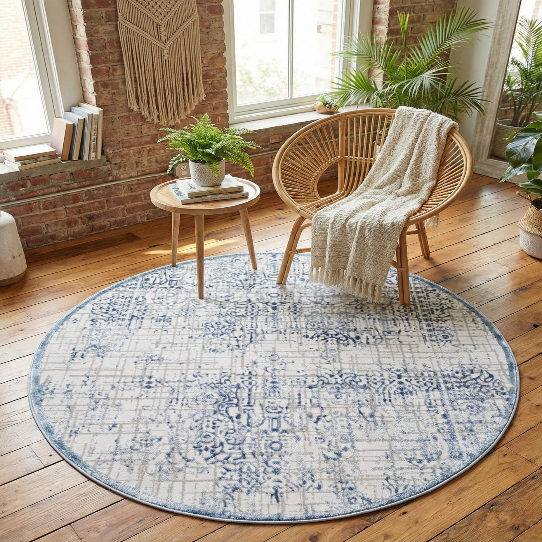 Primary color is Blue. Colors in this rug include: Blue, Beige, Ivory.