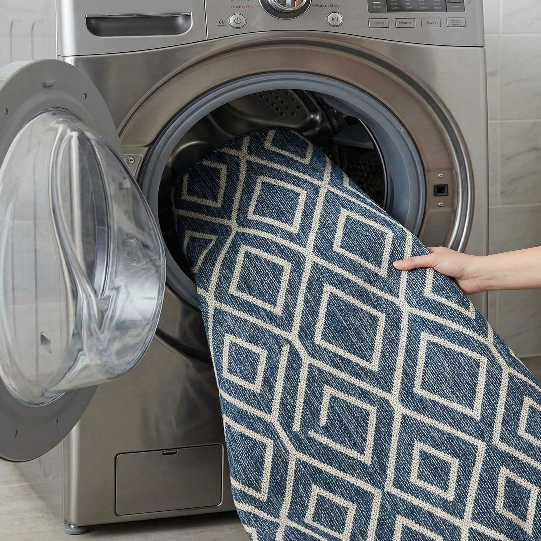 Primary color is Blue. Colors in this rug include: Blue, Ivory.