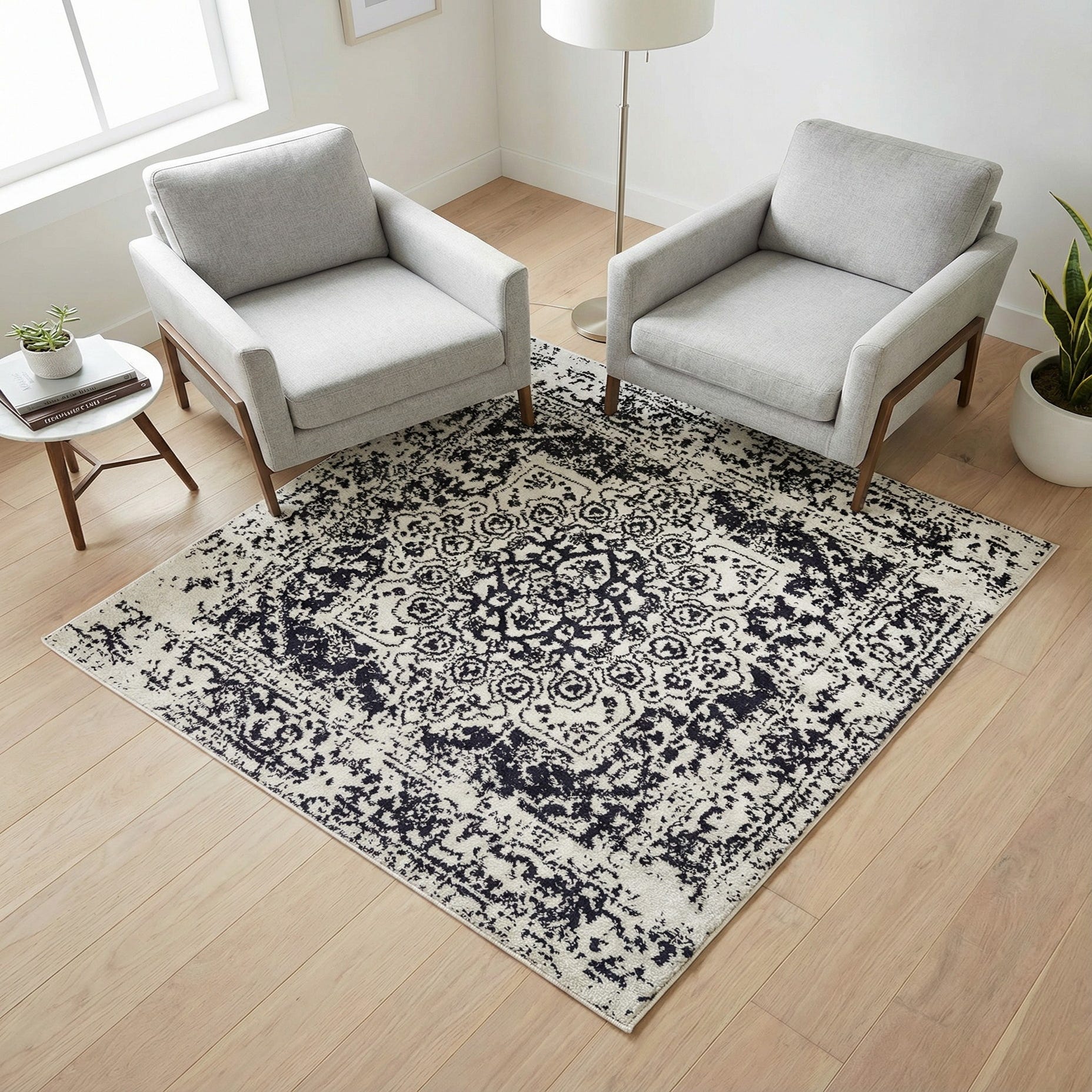 Primary color is Blue. Colors in this rug include: Blue, Ivory.