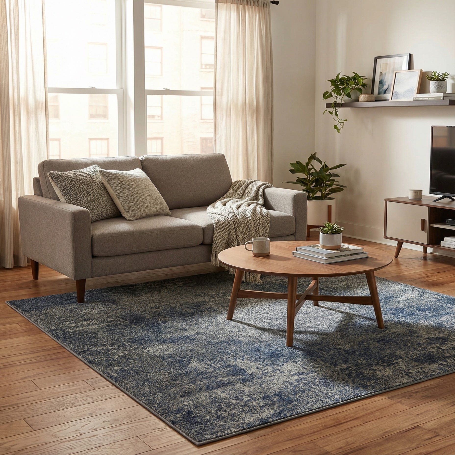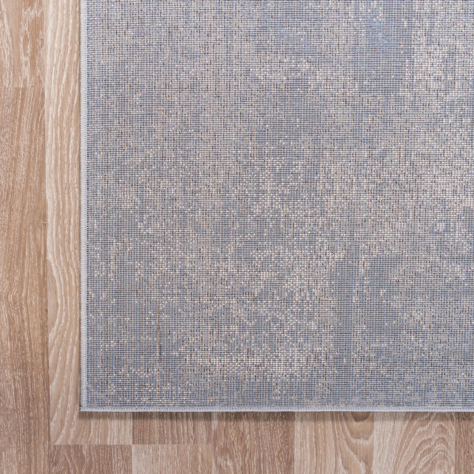 Primary color is Blue. Colors in this rug include: Blue, Gray, Ivory.