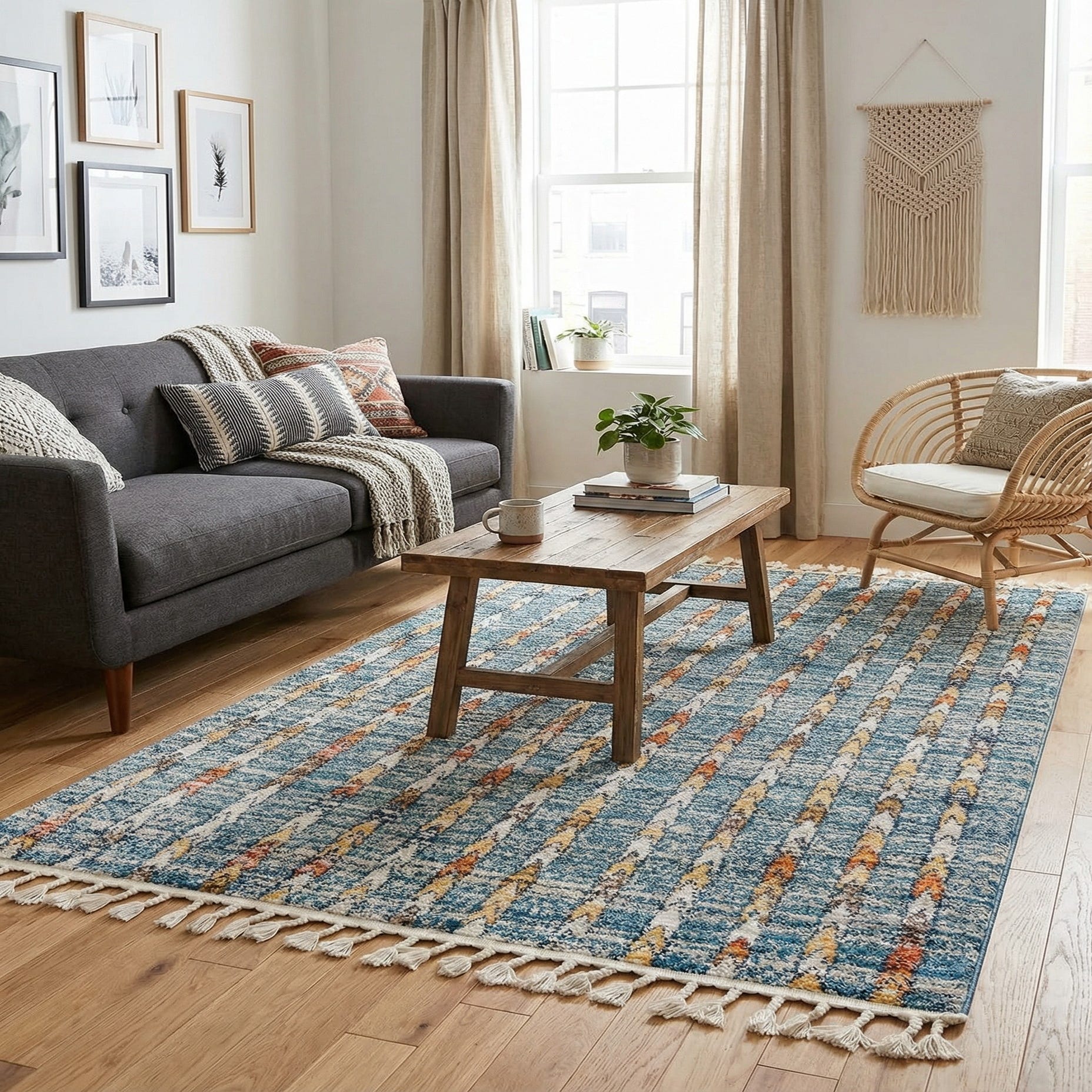 Primary color is Blue. Colors in this rug include: Blue, Ivory, Light Brown, Navy Blue, Rust Red.