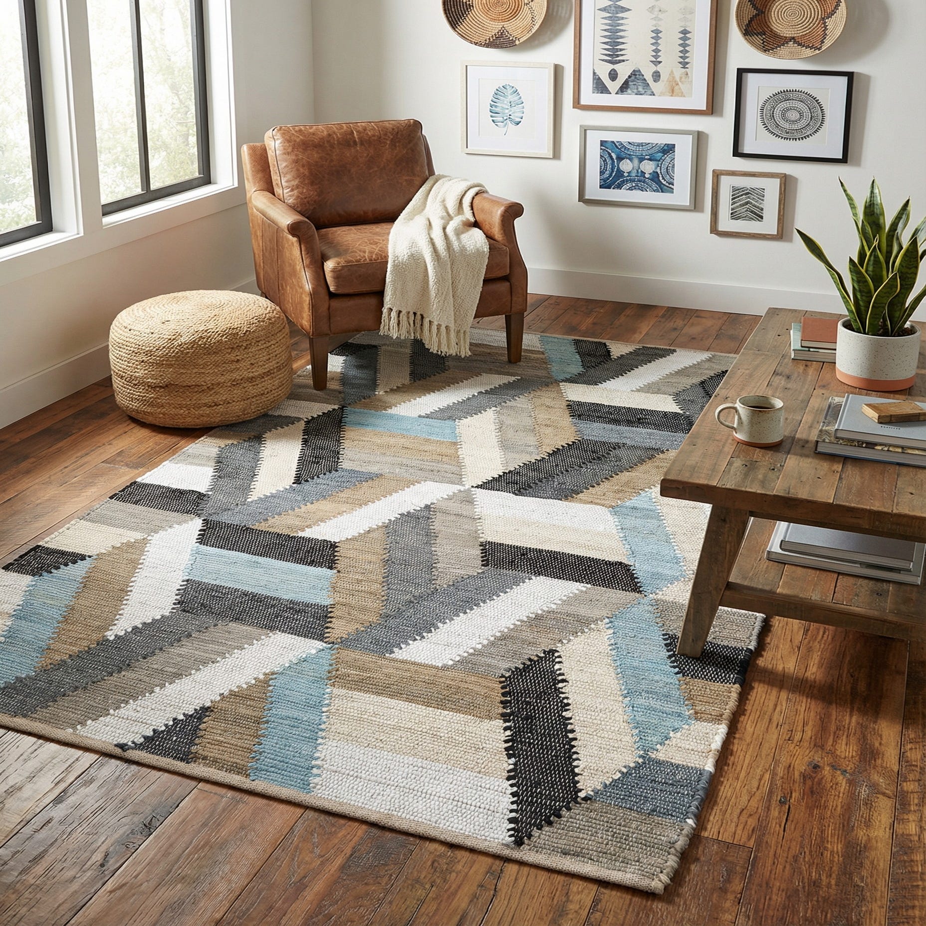 Primary color is Blue. Colors in this rug include: Blue, Ivory, Light Brown, Black, Beige.