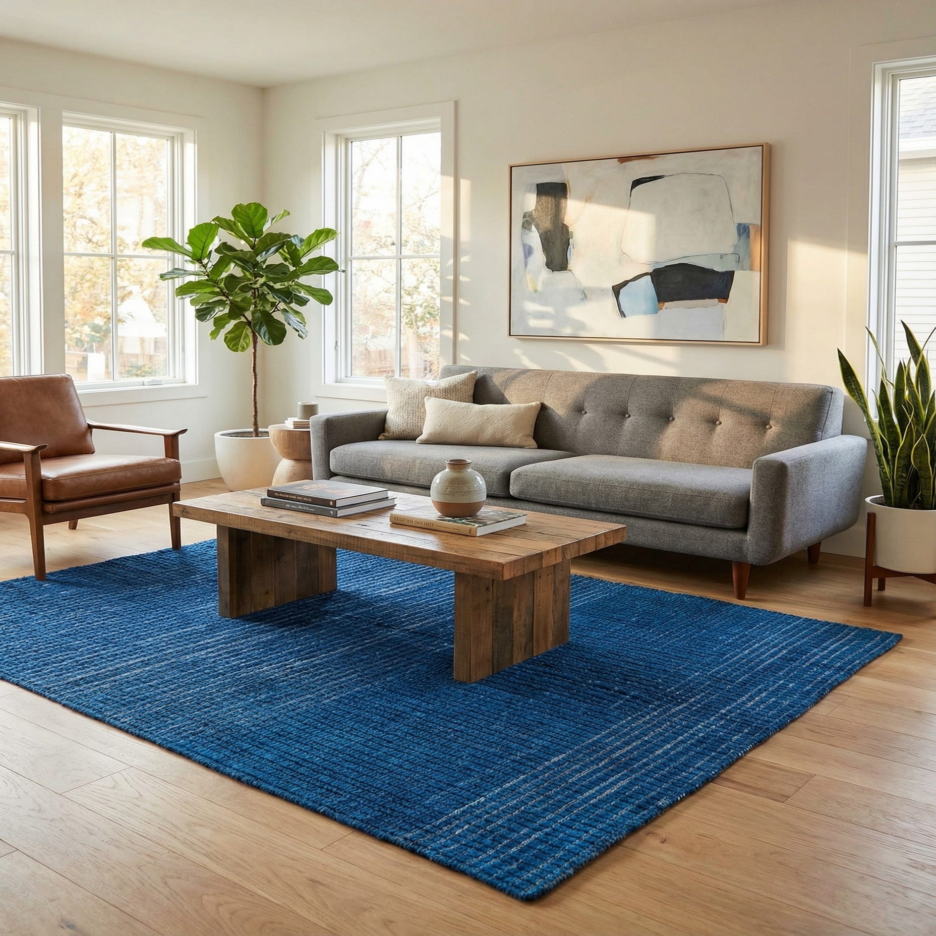 Primary color is Blue. Colors in this rug include: Blue, Ivory.