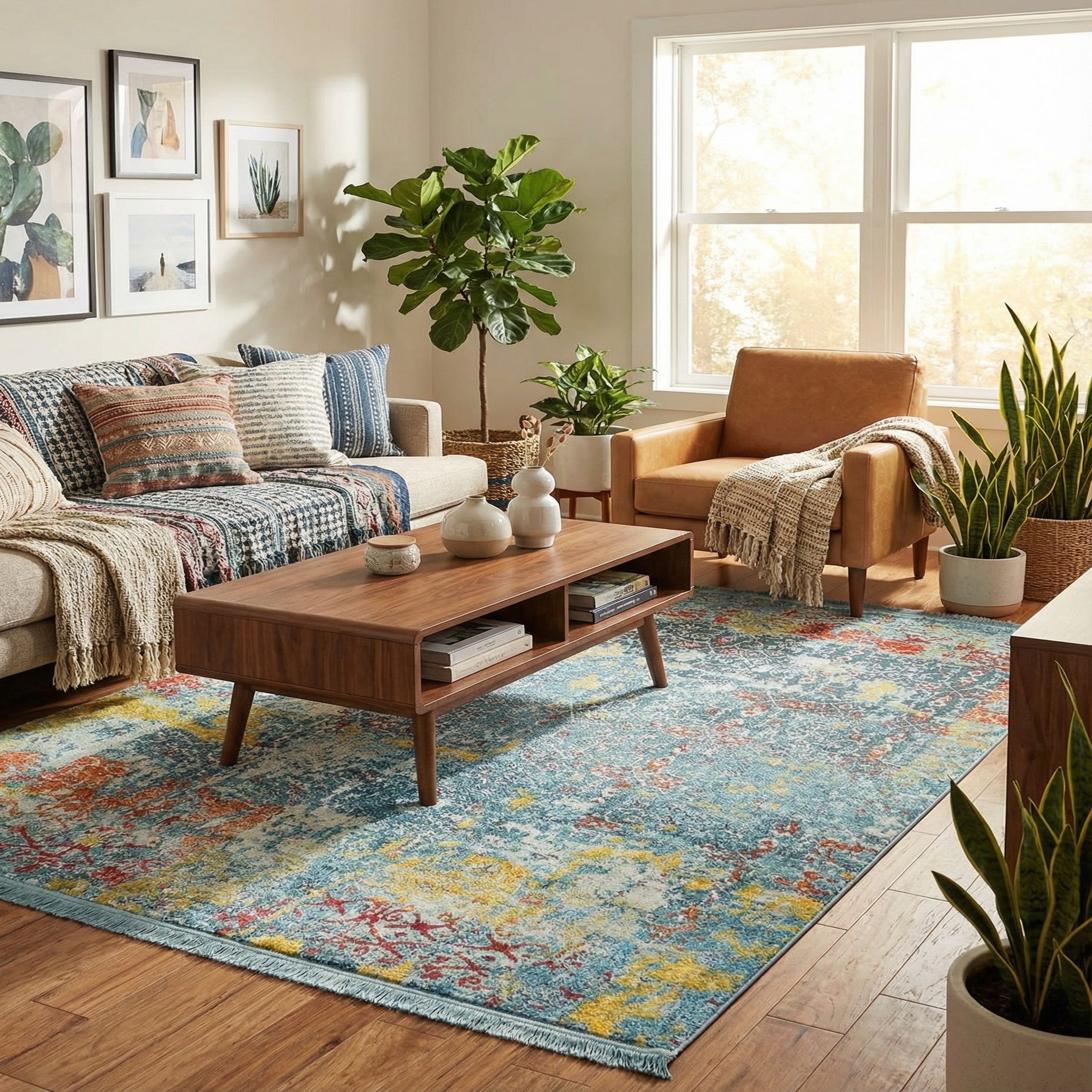 Primary color is Blue. Colors in this rug include: Blue, Olive, Turquoise, Yellow.