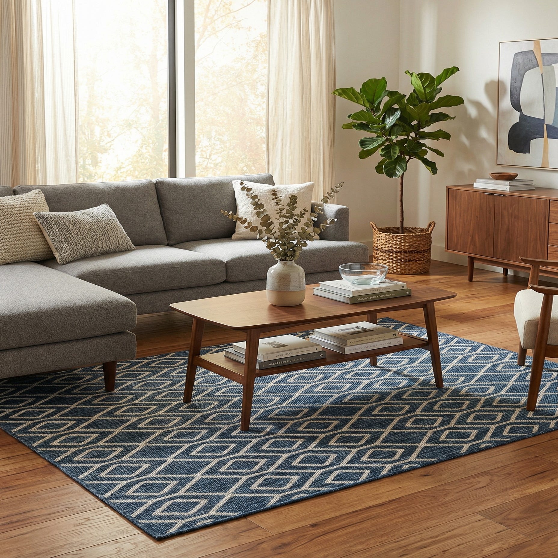 Primary color is Blue. Colors in this rug include: Blue, Ivory.