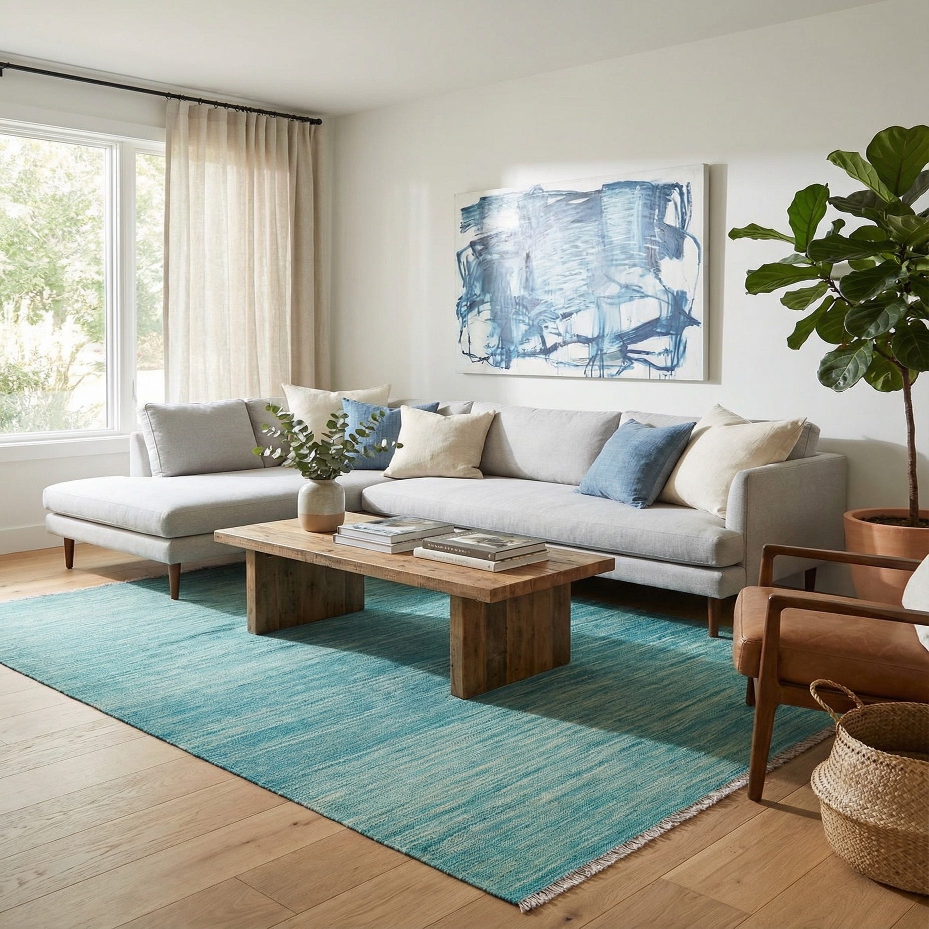 Primary color is Blue. Colors in this rug include: Blue, Beige.