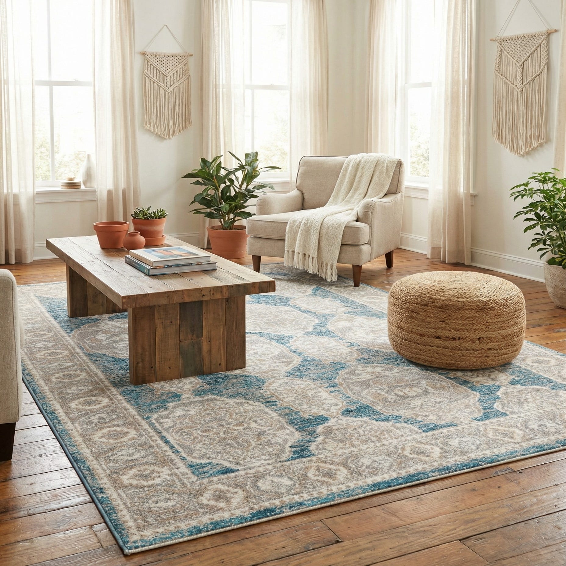 Primary color is Blue. Colors in this rug include: Blue, Beige, Ivory, Light Blue.