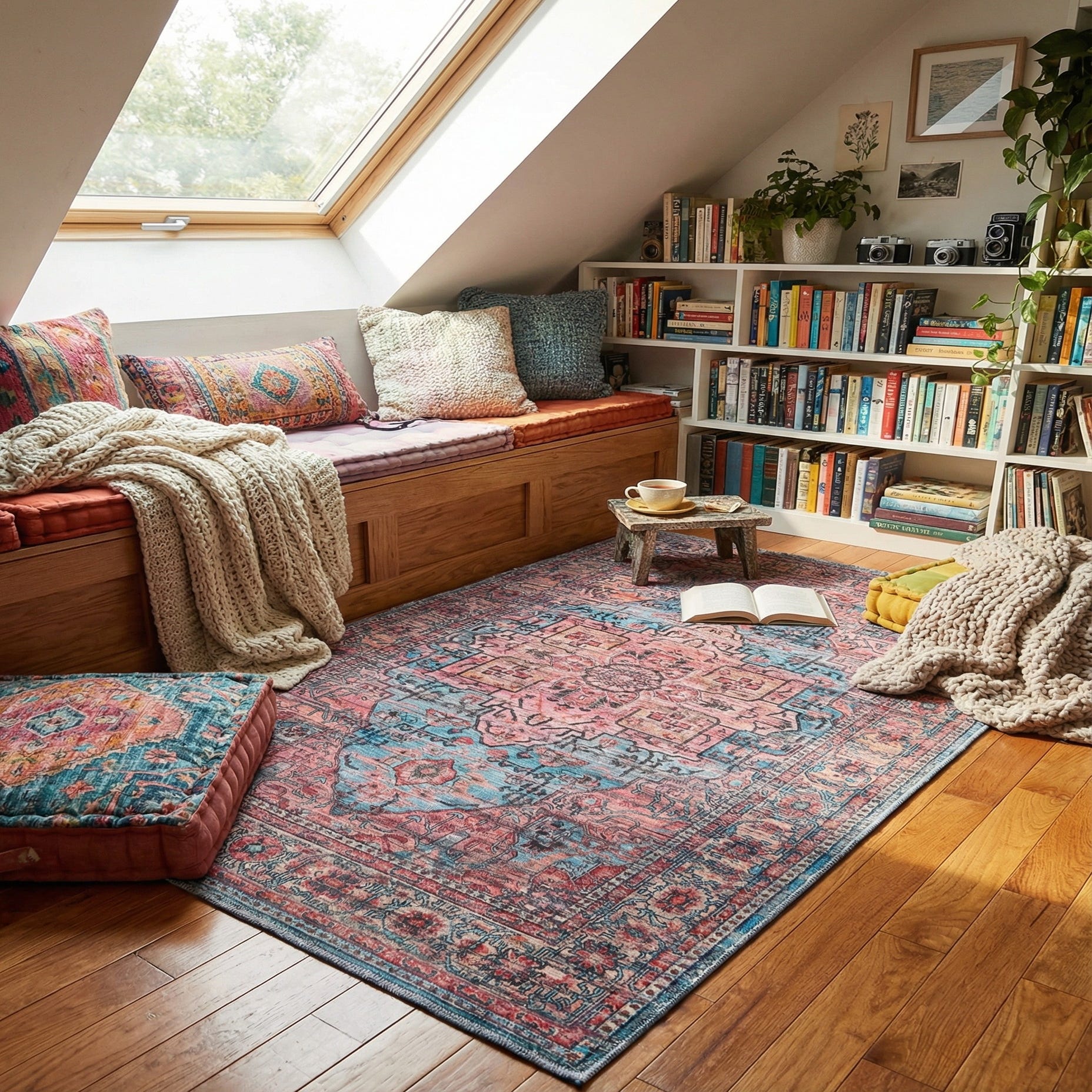 Primary color is Blue. Colors in this rug include: Blue, Beige, Black, Navy Blue, Rust Red.
