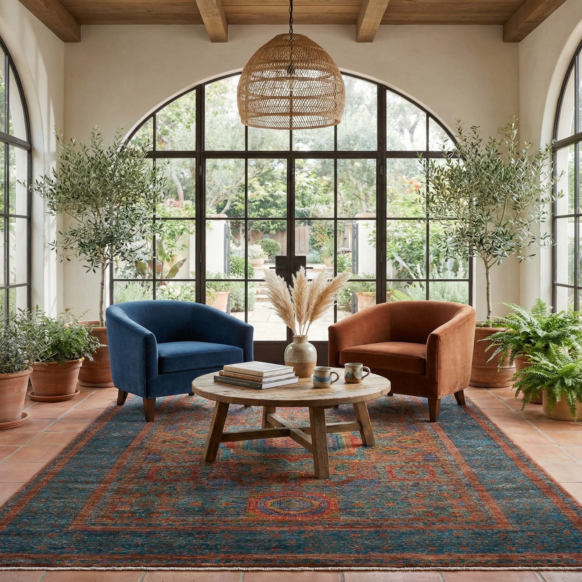 Primary color is Blue. Colors in this rug include: Blue, Blue, Brown, Orange, Green.