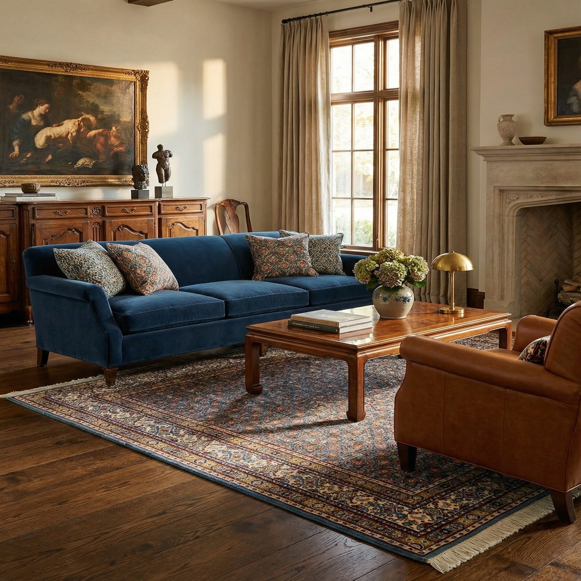 Primary color is Blue. Colors in this rug include: Blue, Blue, Cream, Brown, Red, Orange.