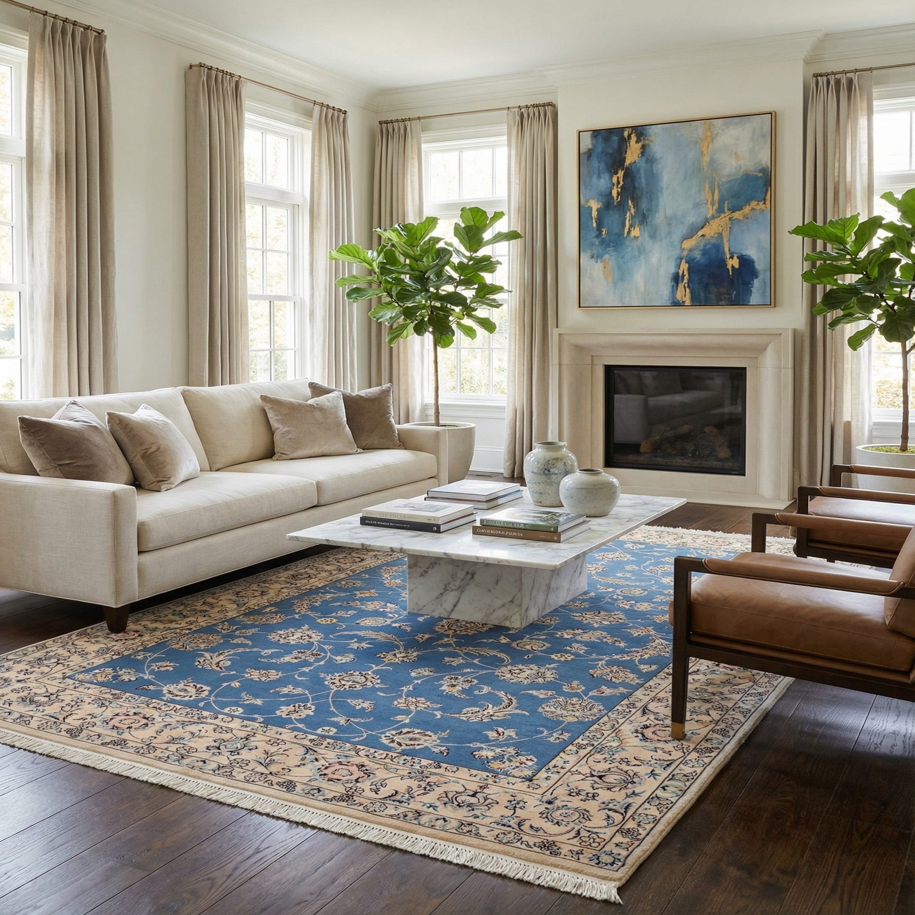 Primary color is Blue. Colors in this rug include: Blue, Beige.