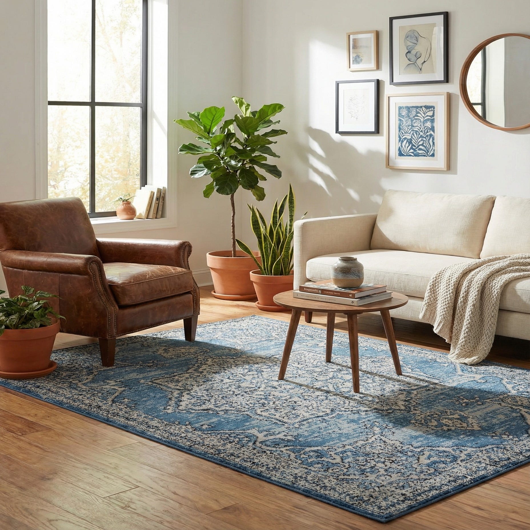 Primary color is Blue. Colors in this rug include: Blue, Black, Ivory, Gray.
