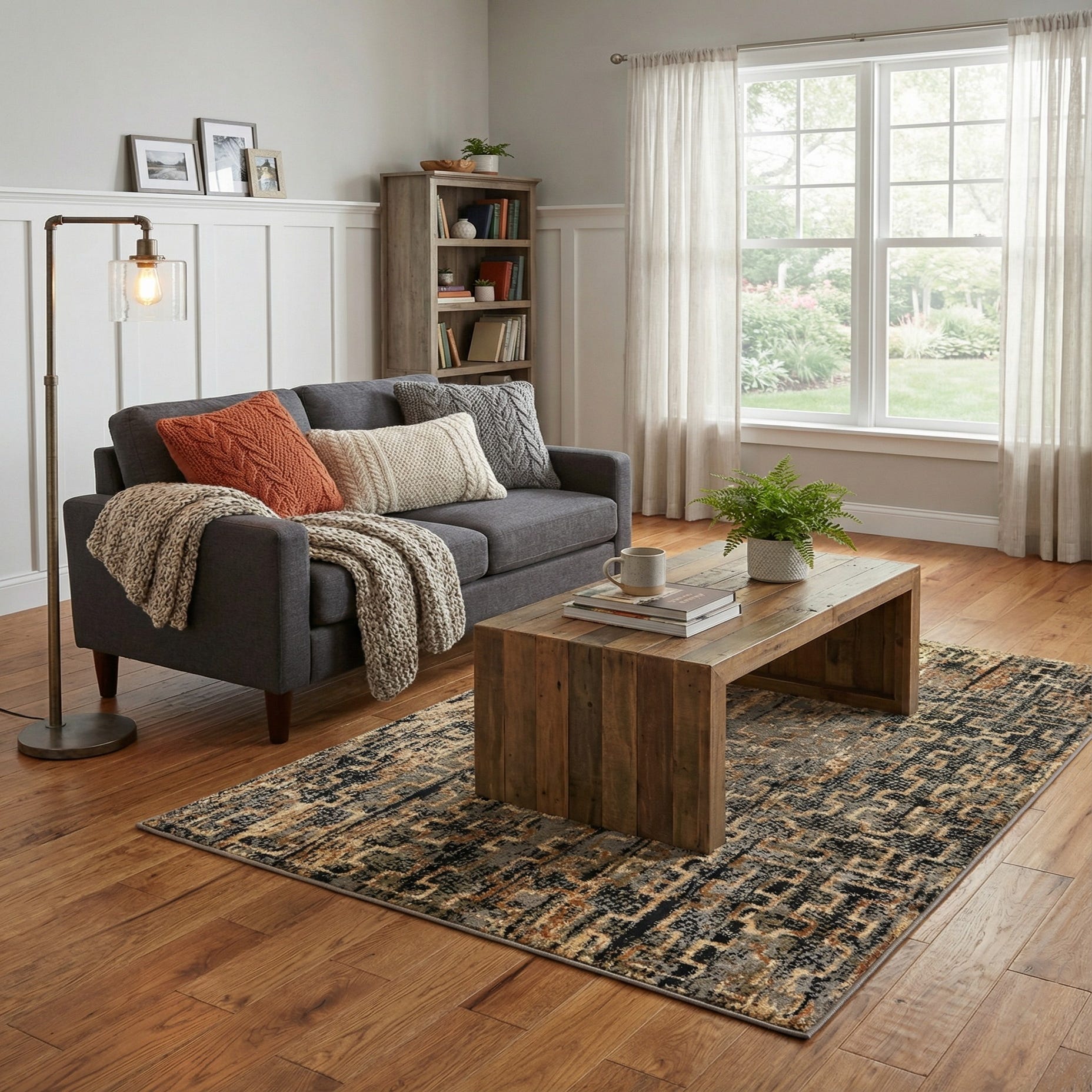 Primary color is Blue. Colors in this rug include: Blue, Black, Gold, Gray, Olive.