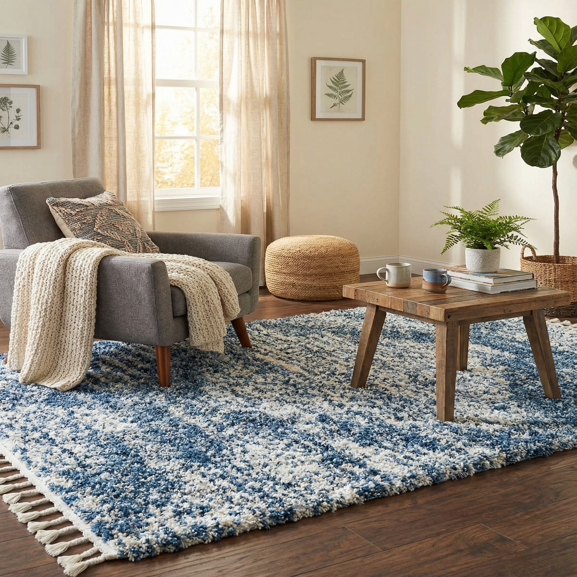 Primary color is Blue. Colors in this rug include: Blue, Gray, Ivory.