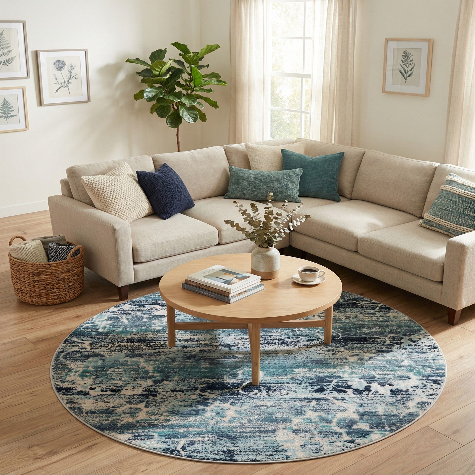 Primary color is Blue. Colors in this rug include: Blue, Gray, Ivory, Navy Blue, Light Blue.