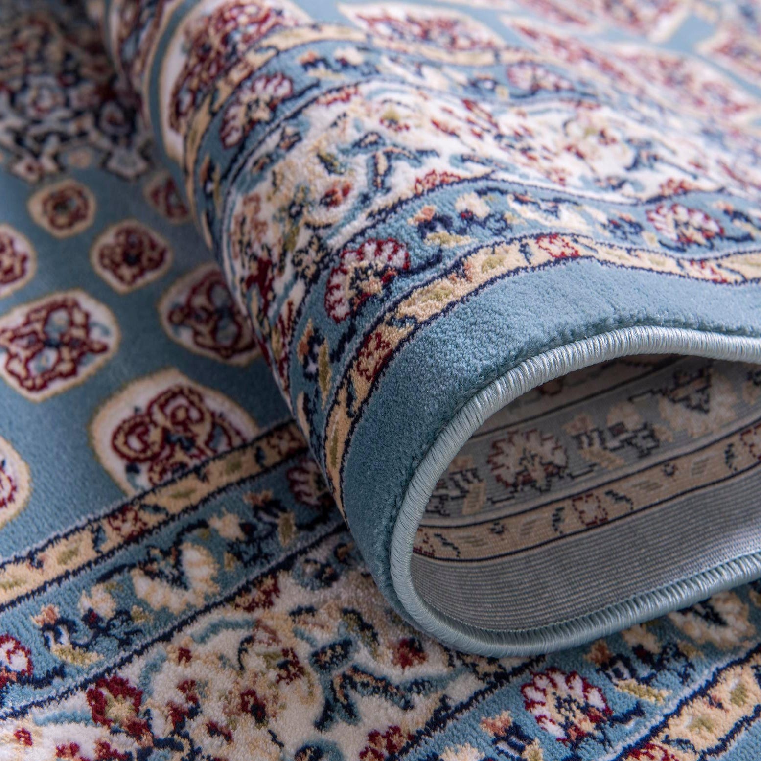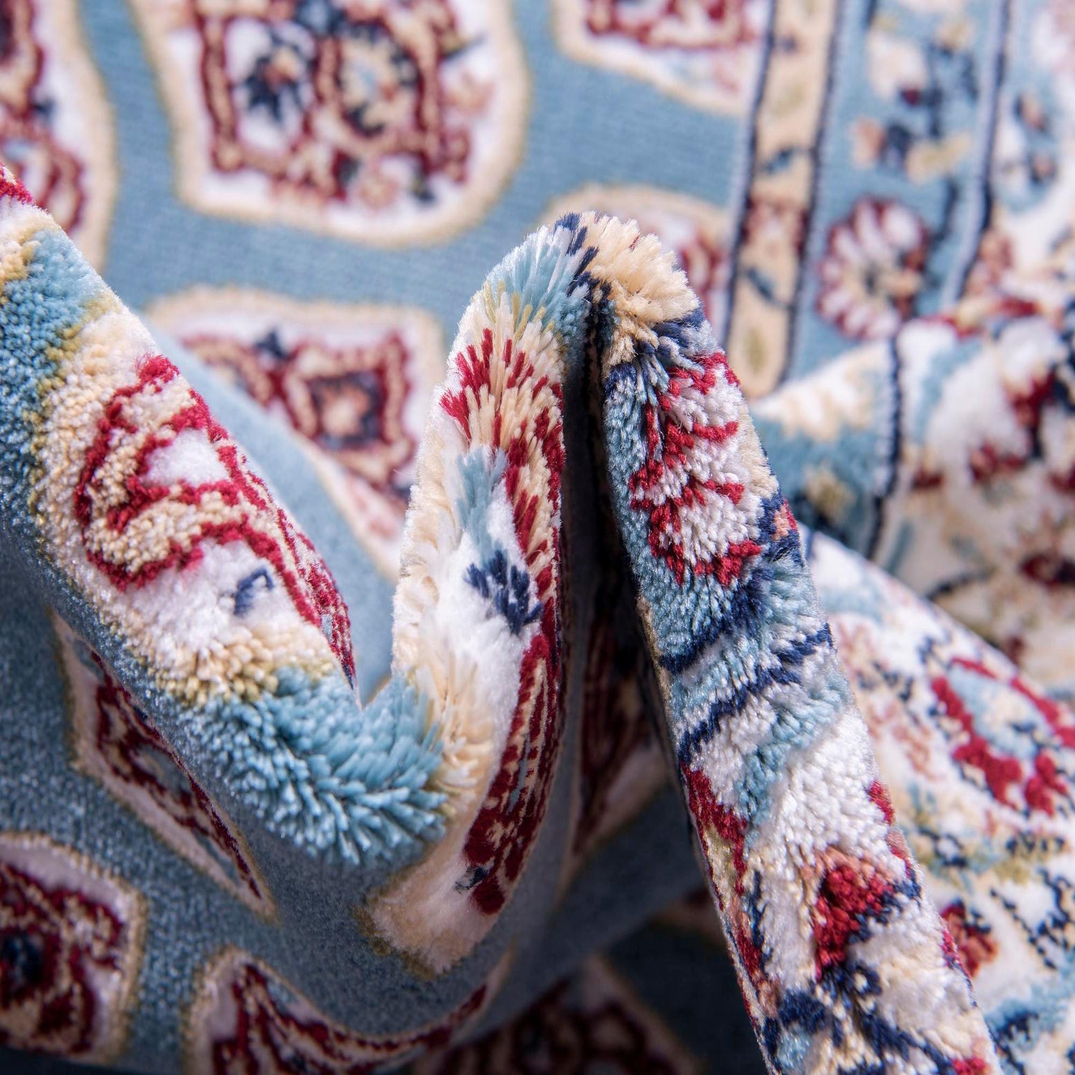 Primary color is Blue. Colors in this rug include: Blue, Burgundy, Cream, Ivory, Light Blue, Light Green, Puce.
