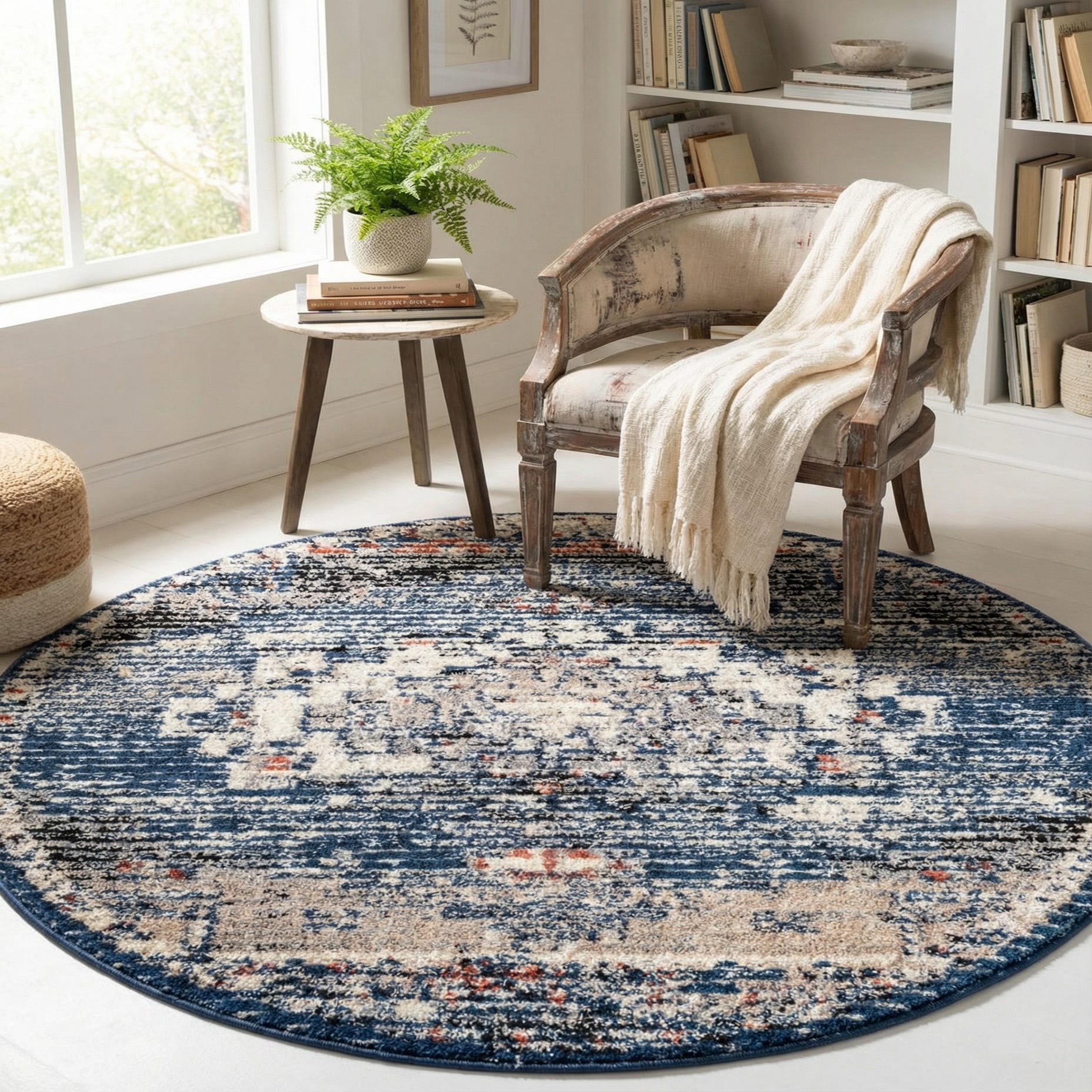 Primary color is Blue. Colors in this rug include: Blue, Beige, Black, Gray, Ivory, Rust Red.
