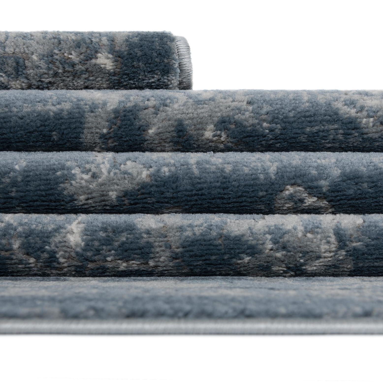 Primary color is Blue. Colors in this rug include: Blue, Gray, Ivory.