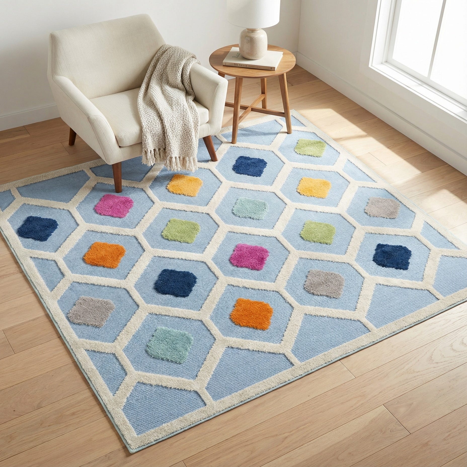 Primary color is Blue. Colors in this rug include: Blue, Gold, Gray, Green, Ivory, Light Blue, Navy Blue, Orange, Pink.
