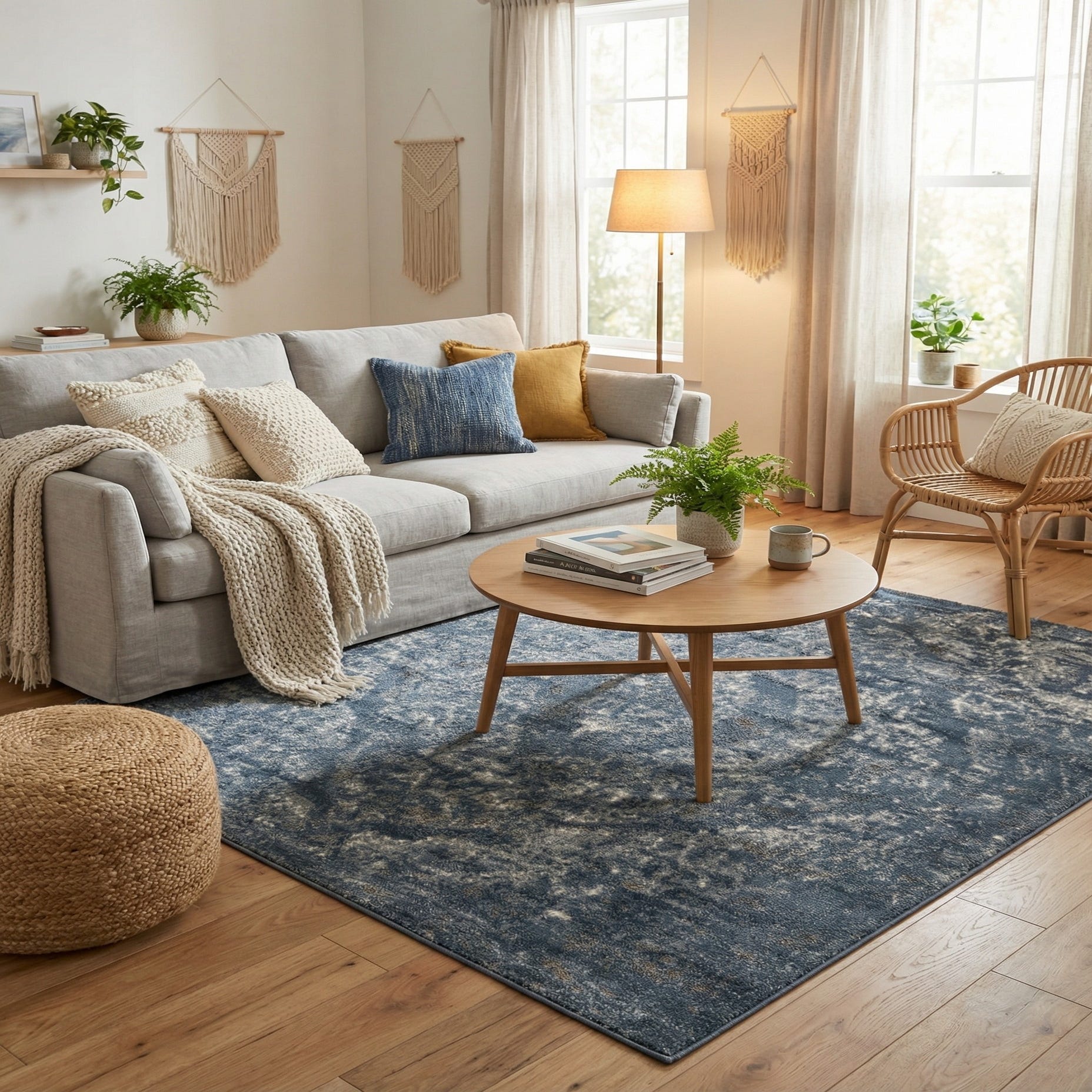 Primary color is Blue. Colors in this rug include: Blue, Gray, Ivory.