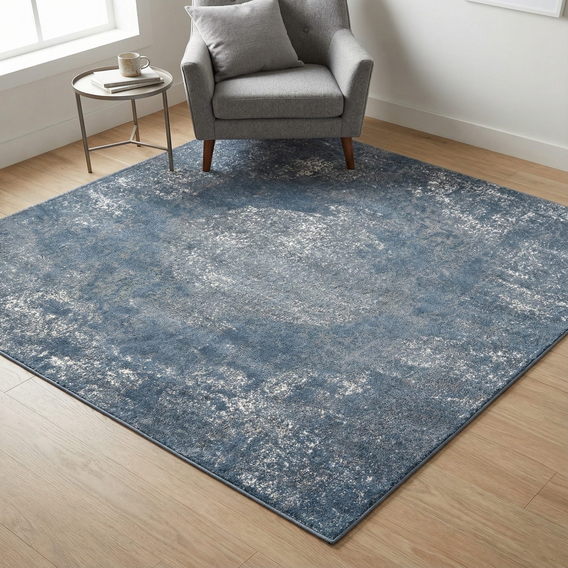 Primary color is Blue. Colors in this rug include: Blue, Ivory, Gray.