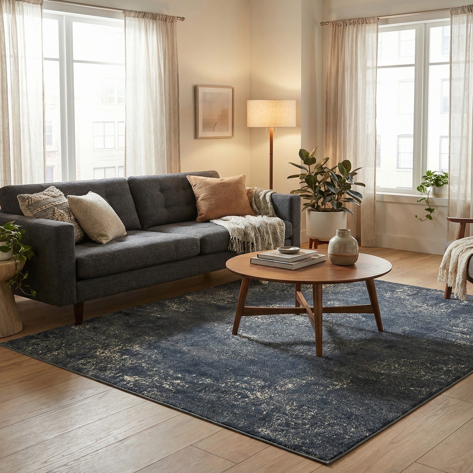 Primary color is Blue. Colors in this rug include: Blue, Ivory, Gray.