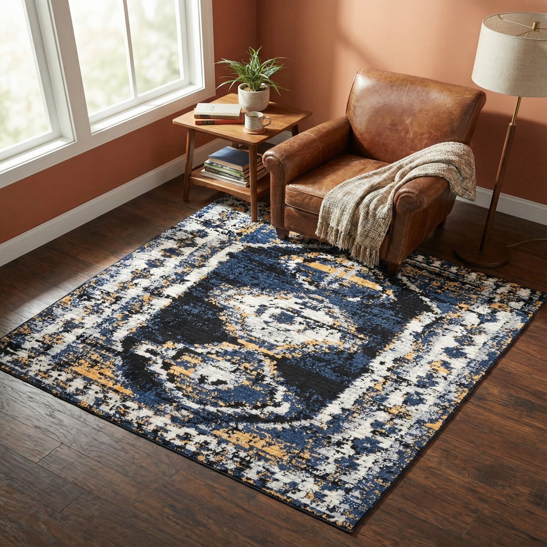 Primary color is Blue. Colors in this rug include: Blue, Black, Gray, Ivory, Orange, Navy Blue, Yellow.