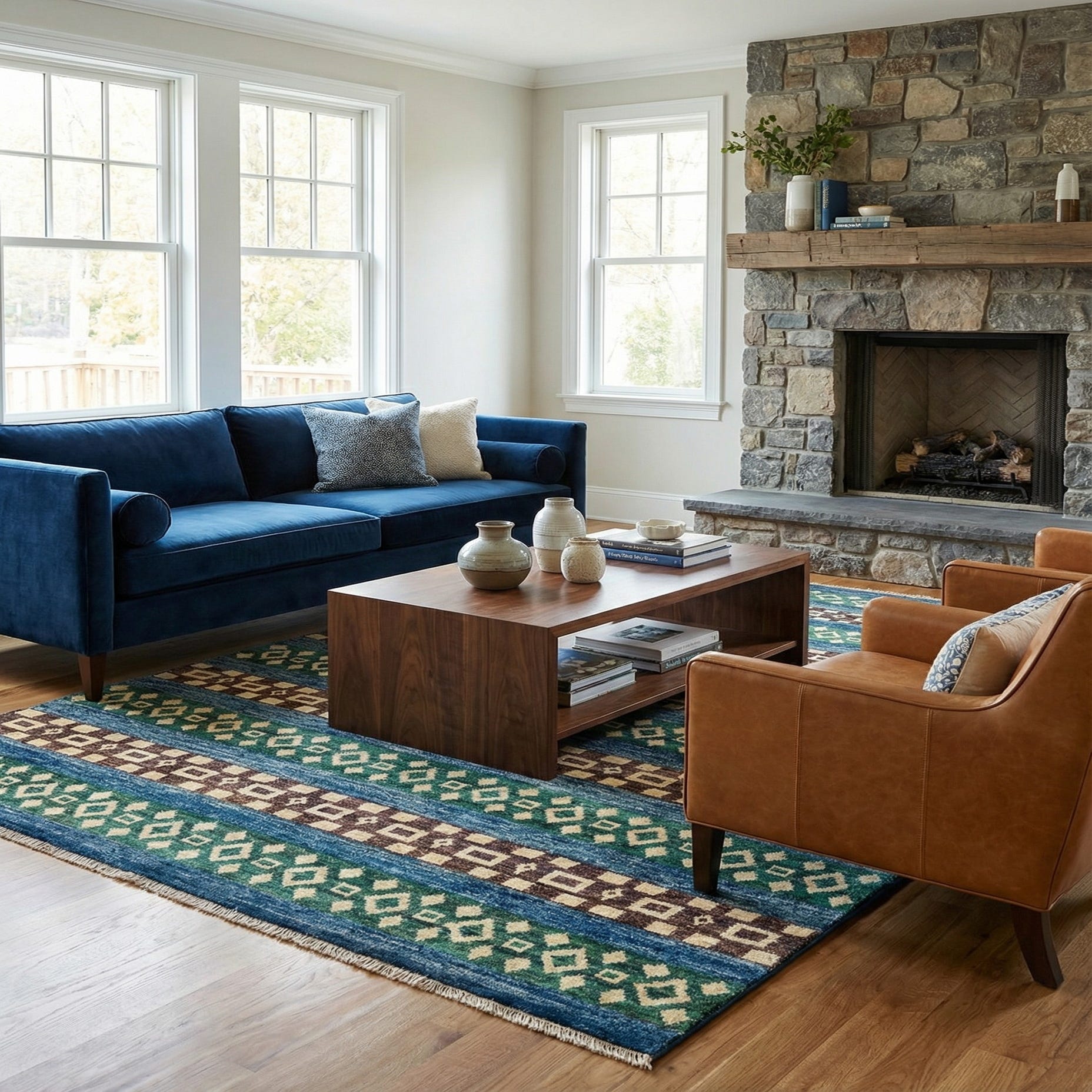 Primary color is Blue. Colors in this rug include: Blue, Brown, Ivory, Green.