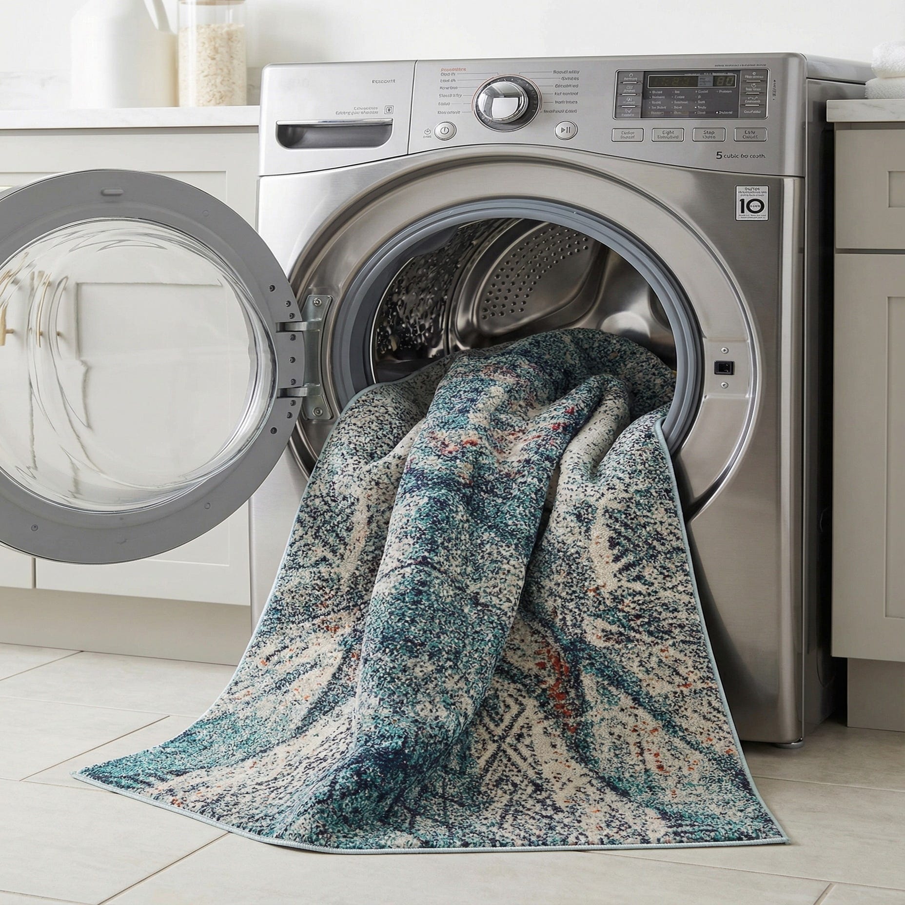 Primary color is Blue. Colors in this rug include: Blue, Cream, Gray, Navy Blue, Orange.