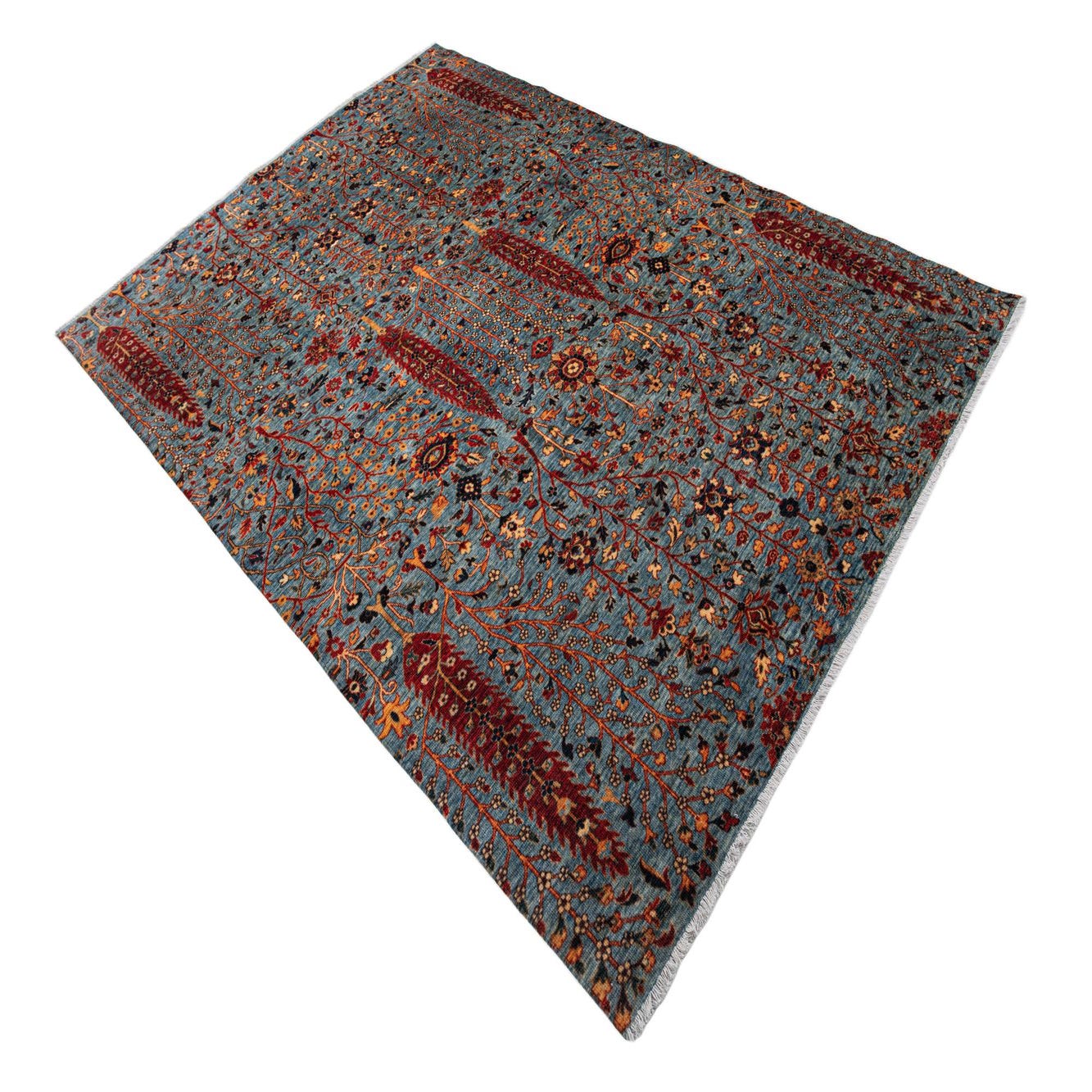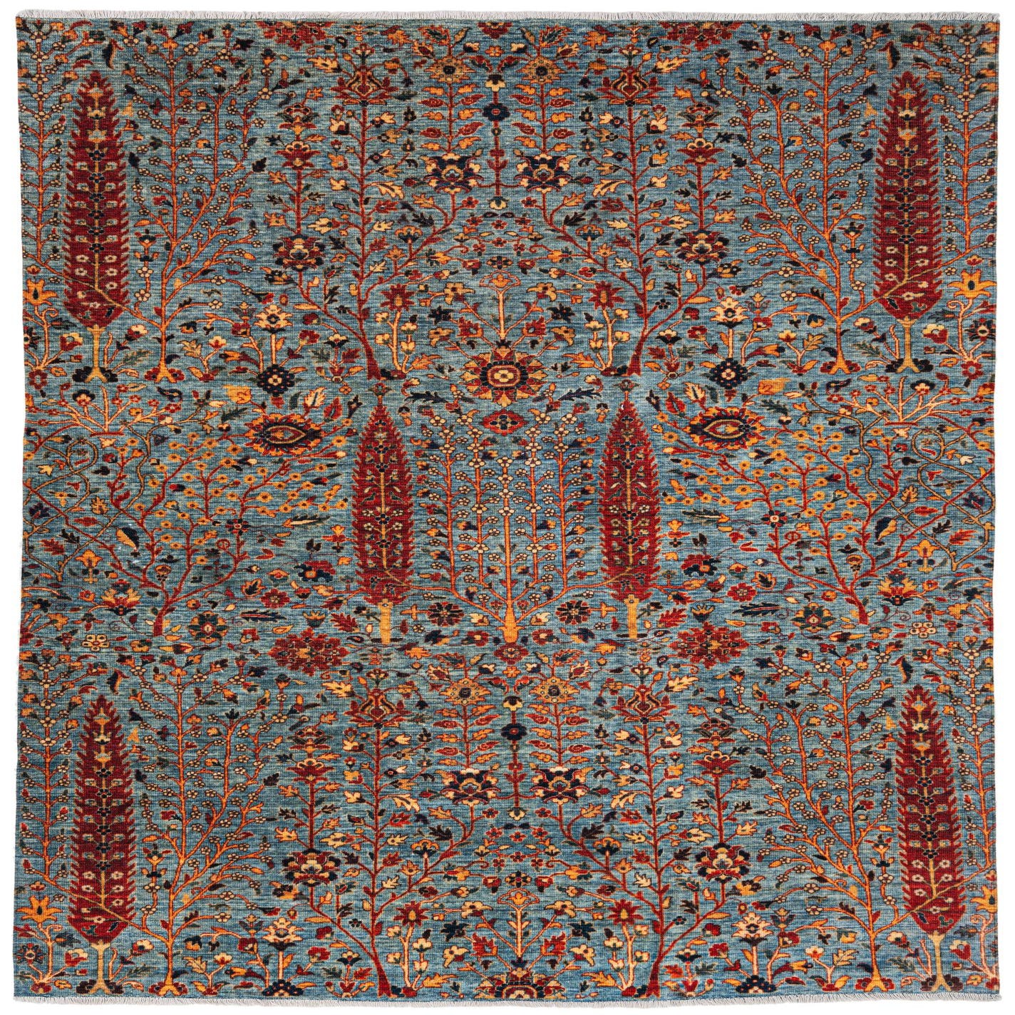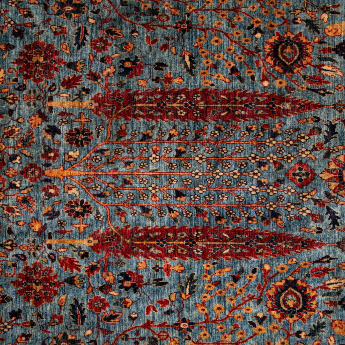 Primary color is Blue. Colors in this rug include: Blue, Brown, Orange, Navy Blue, Yellow.