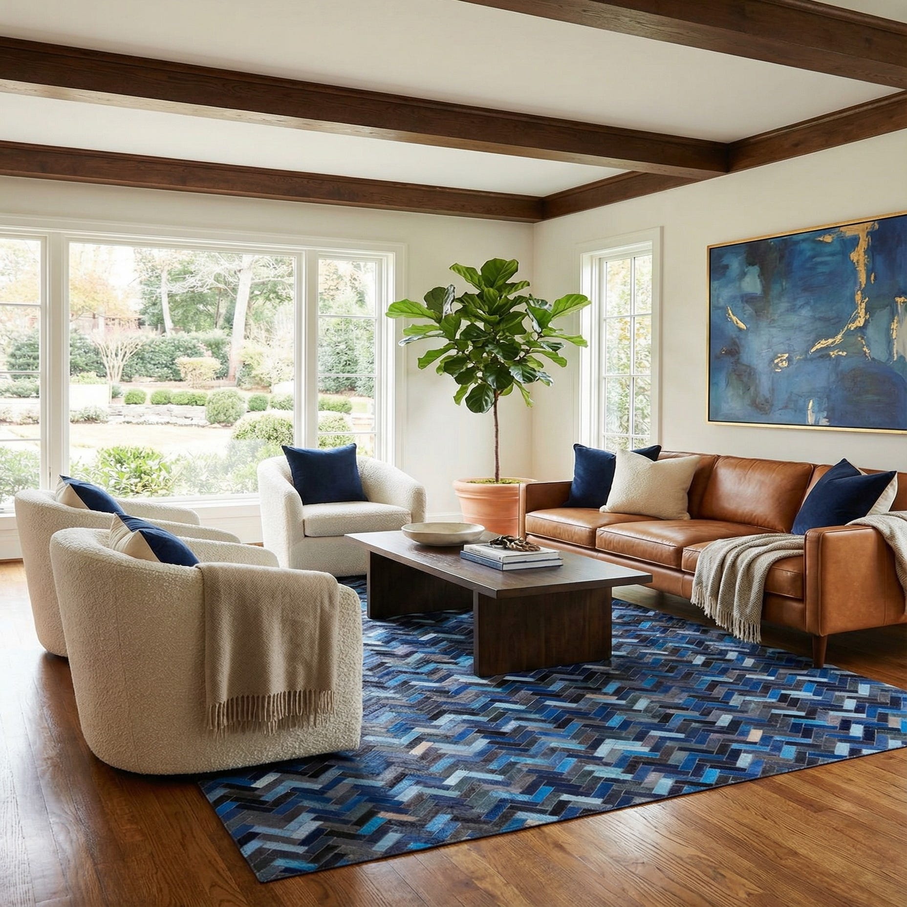 Primary color is Blue. Colors in this rug include: Blue, Black, Light Blue, Navy Blue, Gray.