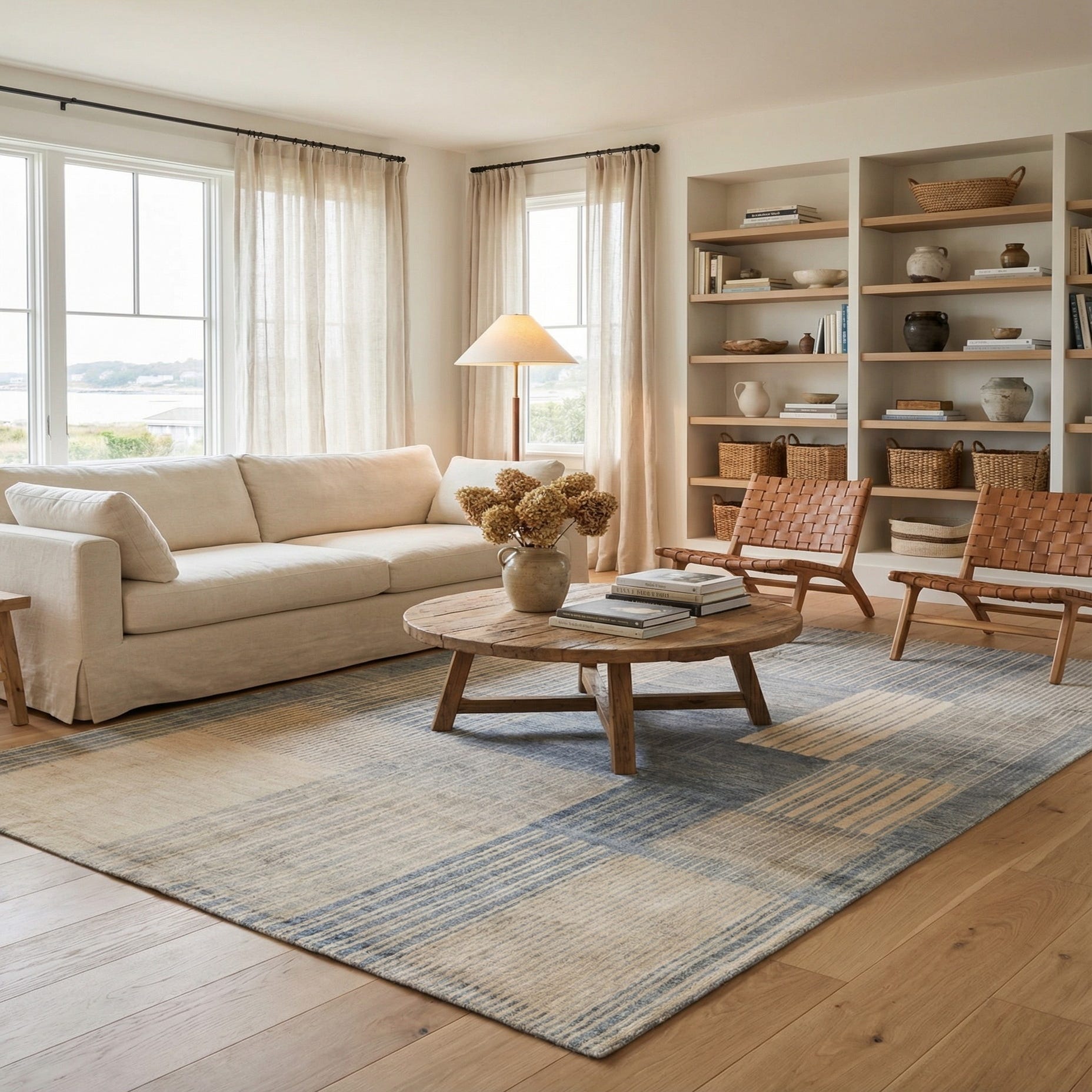 Primary color is Blue. Colors in this rug include: Blue, Gray, Light Blue, Cream.