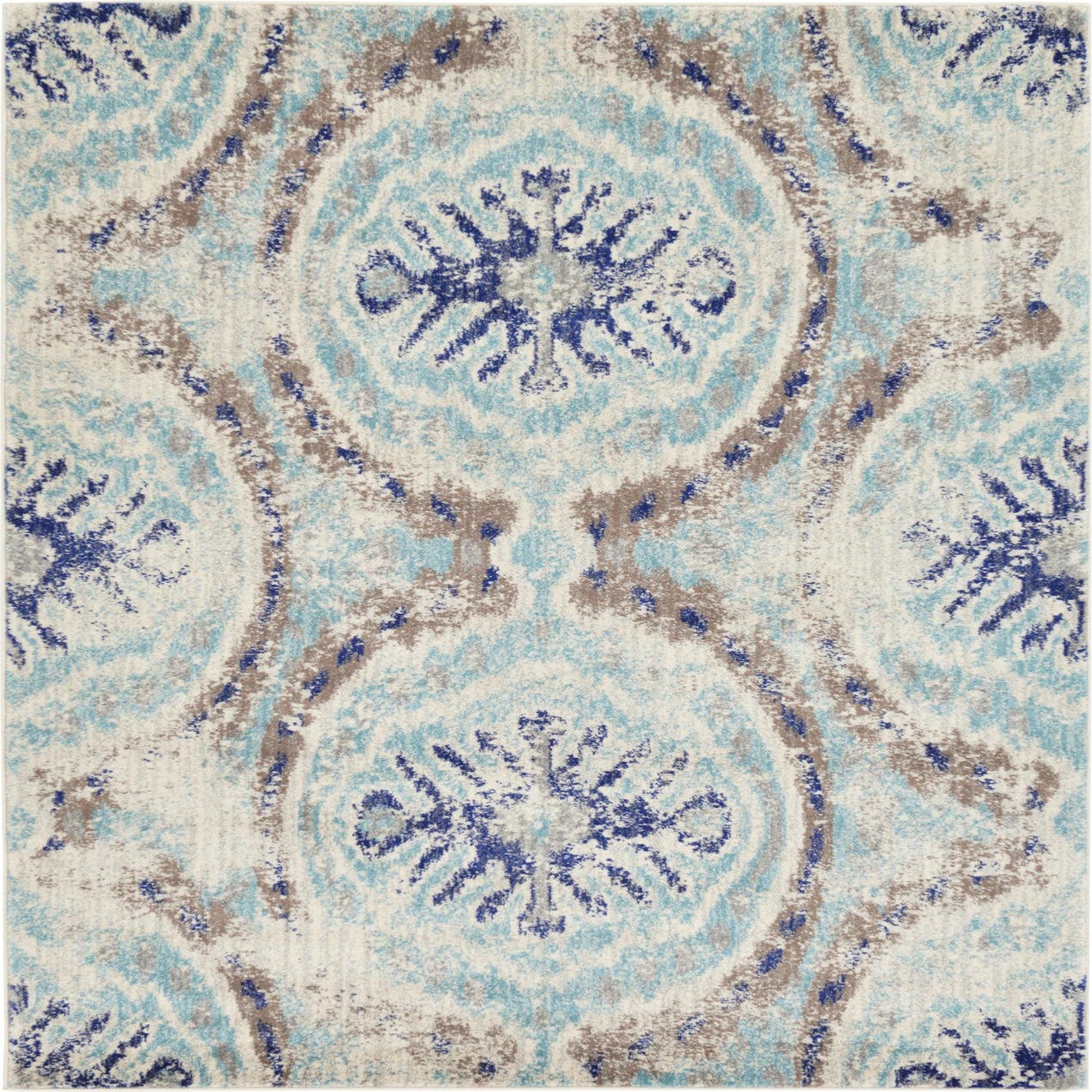 Primary color is Blue. Colors in this rug include: Blue, Gray, Light Brown, Navy Blue.
