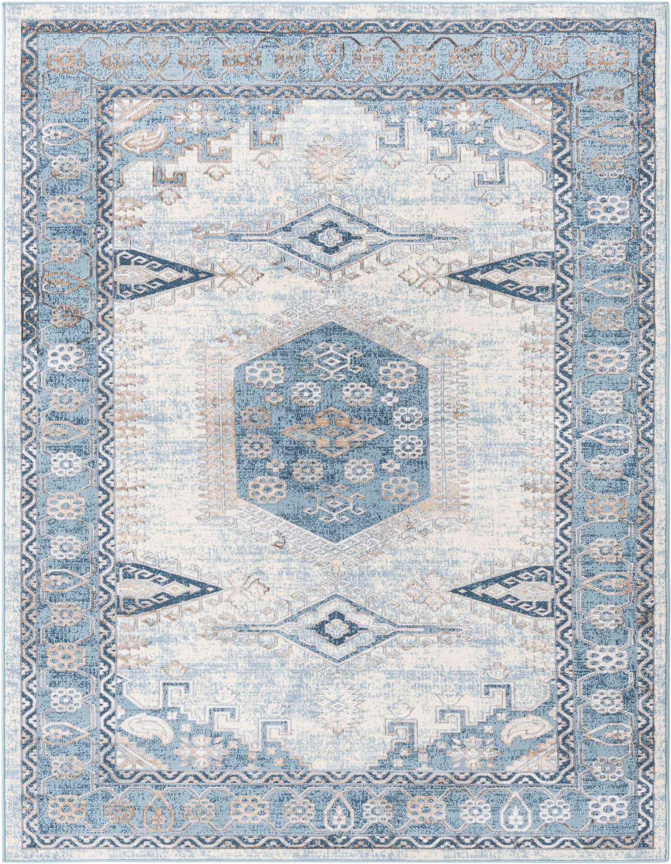 Primary color is Blue. Colors in this rug include: Blue, Ivory, Gray, Light Blue, Light Brown, Navy Blue.