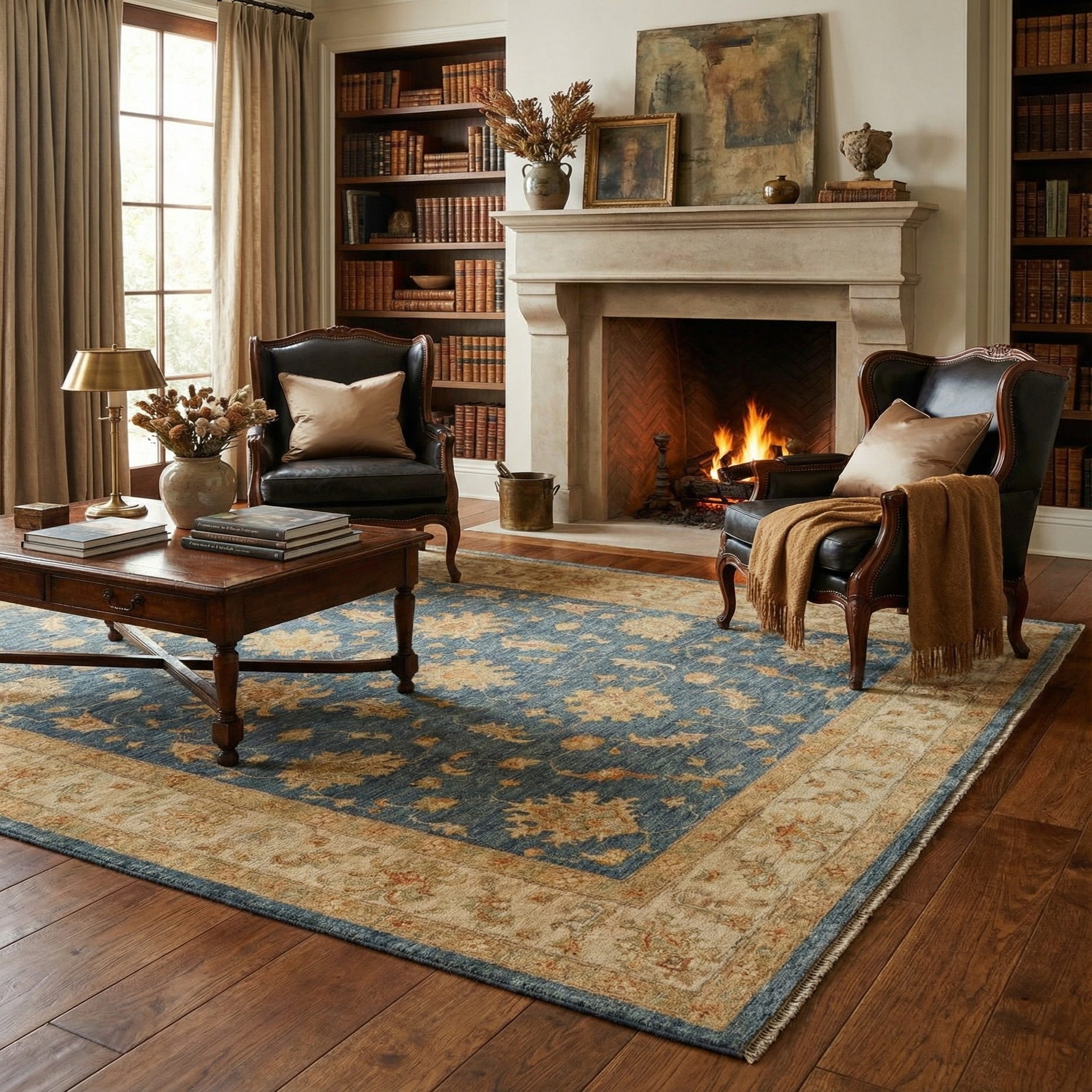 Primary color is Blue. Colors in this rug include: Blue, Blue, Beige.