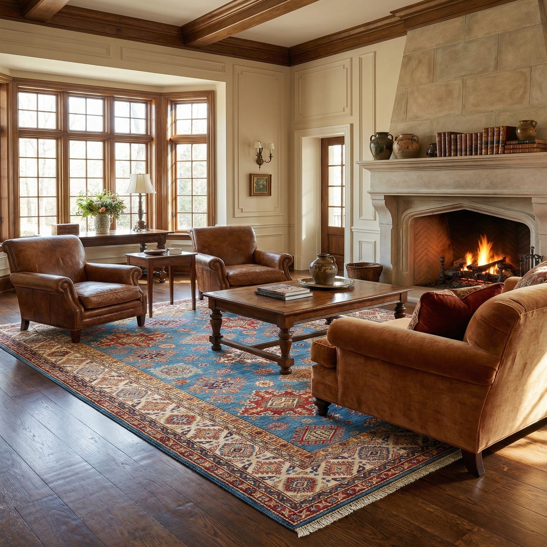 Primary color is Blue. Colors in this rug include: Blue, Blue, Cream, Red, Green, Yellow, Brown, Orange.