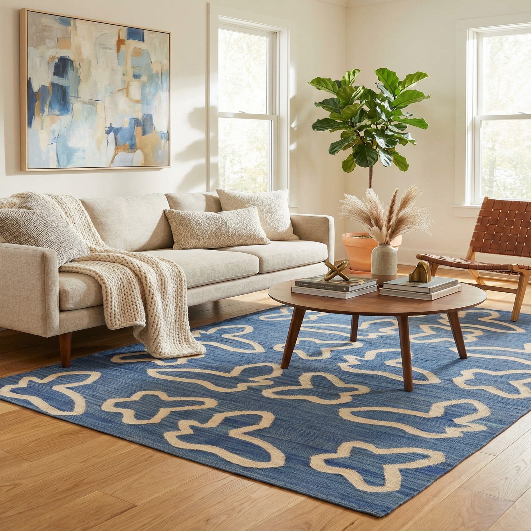 Primary color is Blue. Colors in this rug include: Blue, Ivory.