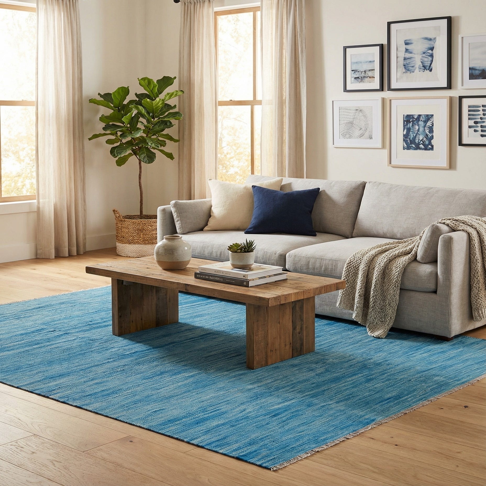 Primary color is Blue. Colors in this rug include: Blue, Beige.