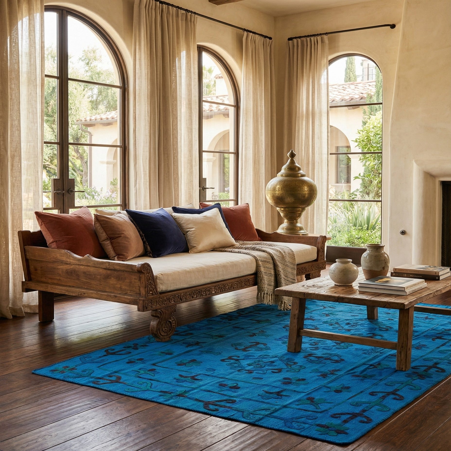 Primary color is Blue. Colors in this rug include: Blue, Red, Green.