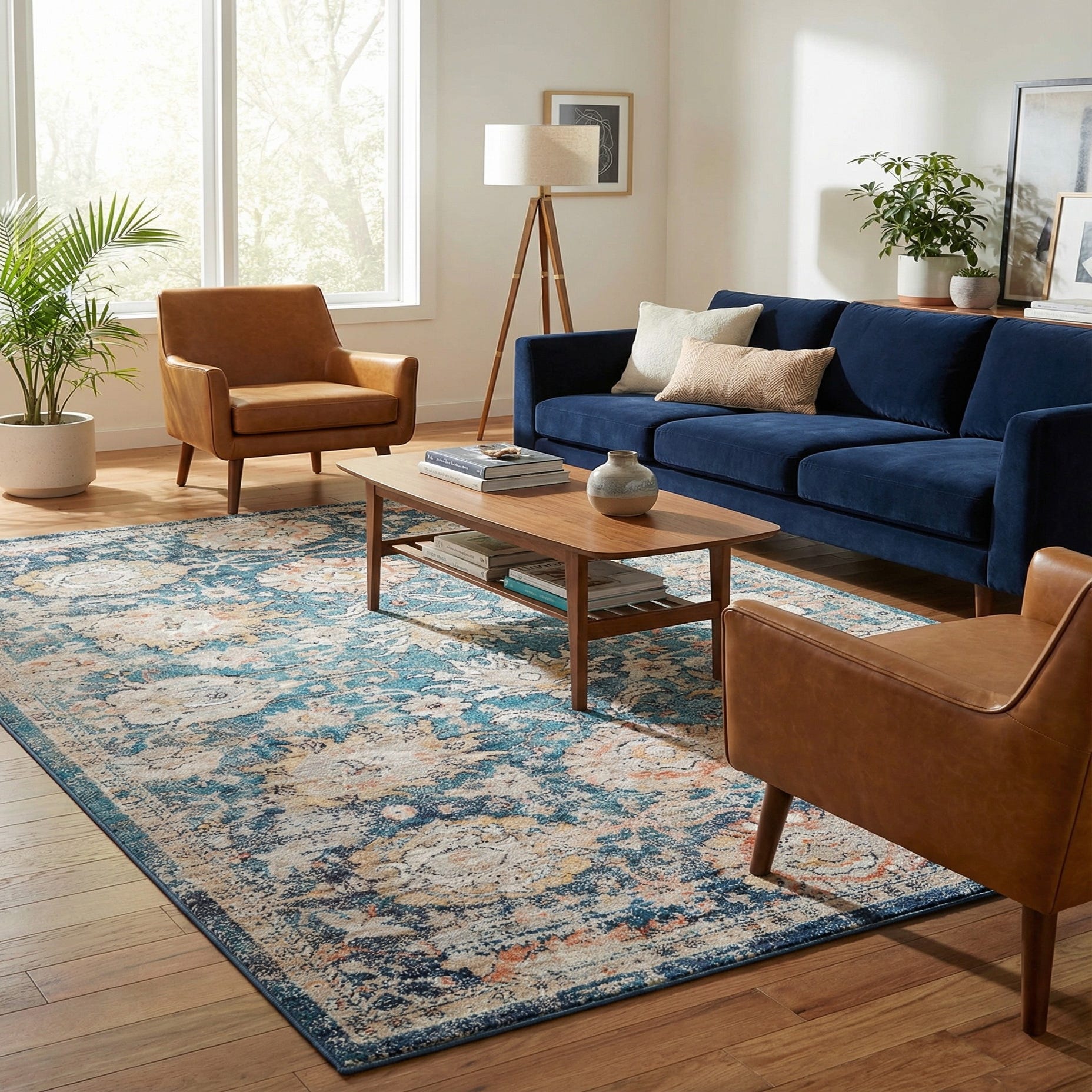 Primary color is Blue. Colors in this rug include: Blue, Black, Gray, Ivory, Light Blue, Rust Red, Tan.