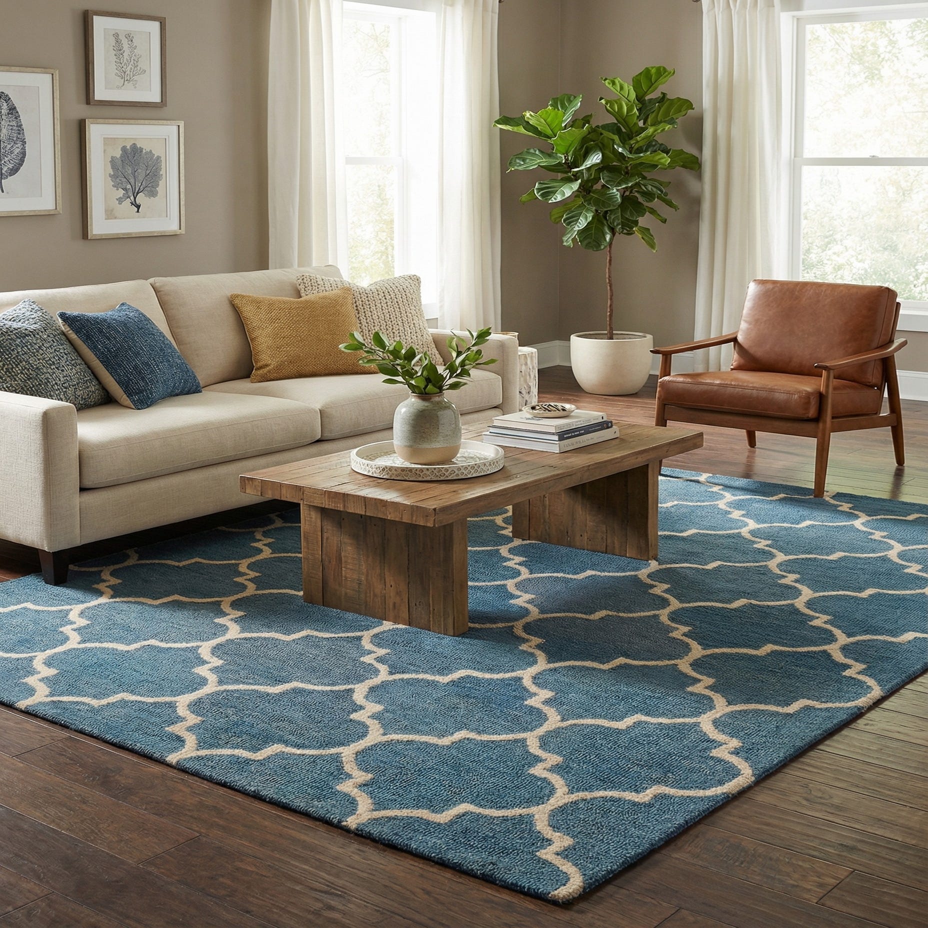 Primary color is Blue. Colors in this rug include: Blue, Ivory.