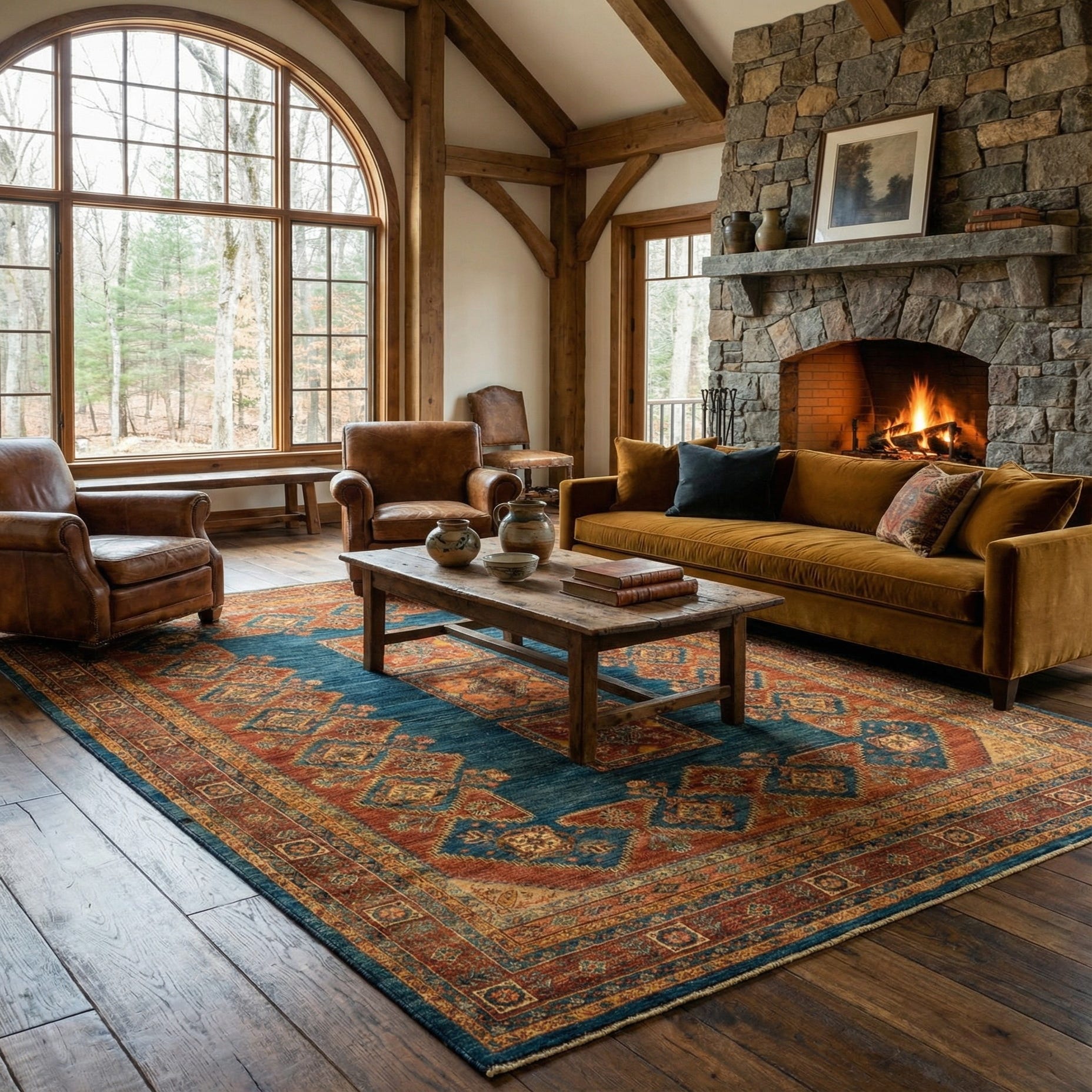 Primary color is Blue. Colors in this rug include: Blue, Blue, Red, Brown, Beige, Orange.