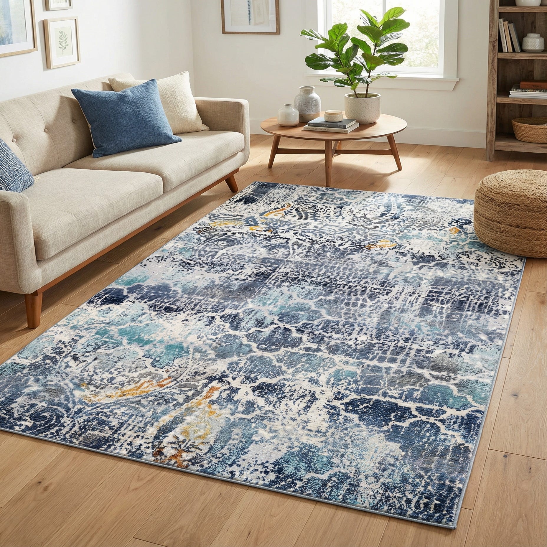 Primary color is Blue. Colors in this rug include: Blue, Gold, Gray, Ivory, Navy Blue, Light Blue.