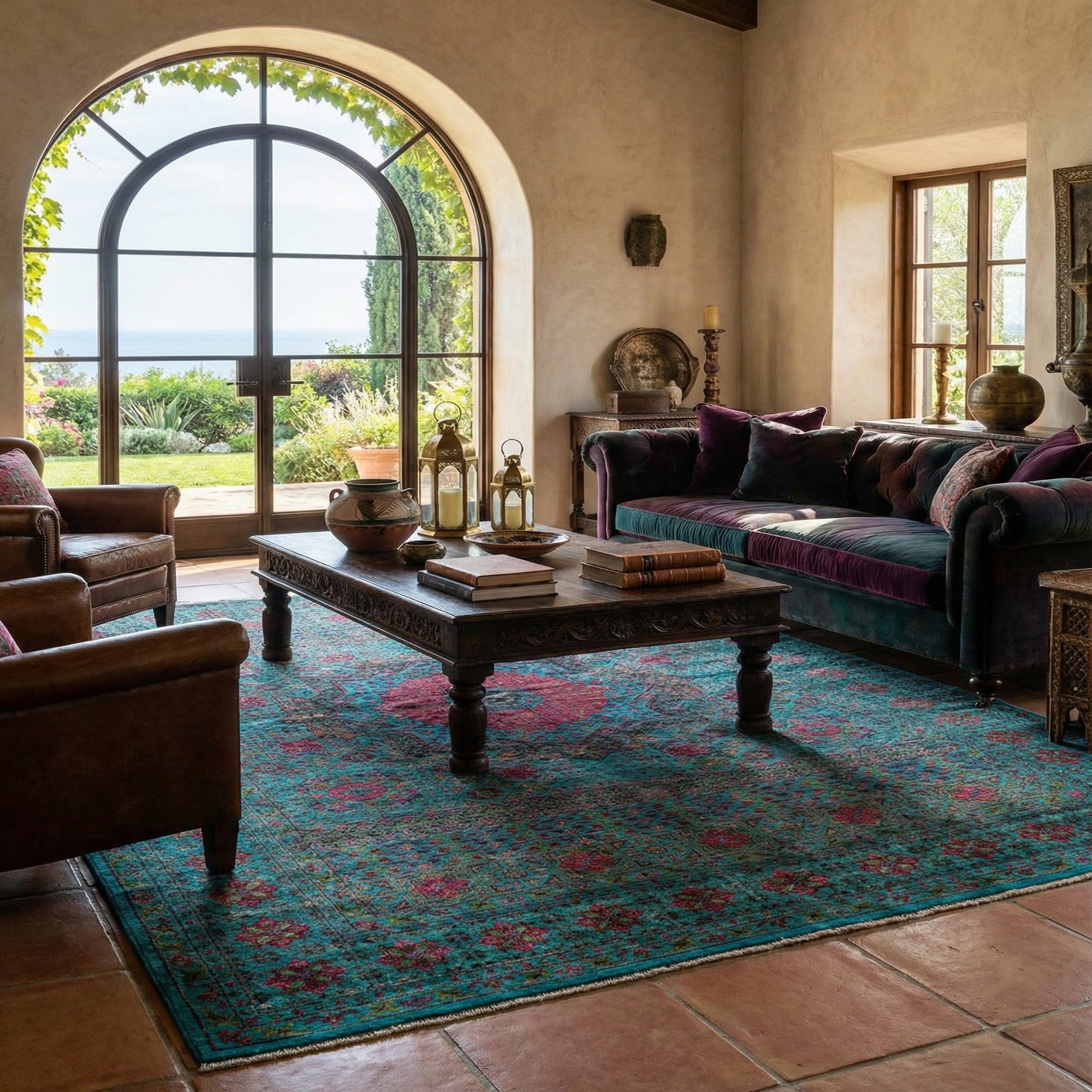 Primary color is Blue. Colors in this rug include: Blue, Blue, Violet, Green, Brown.