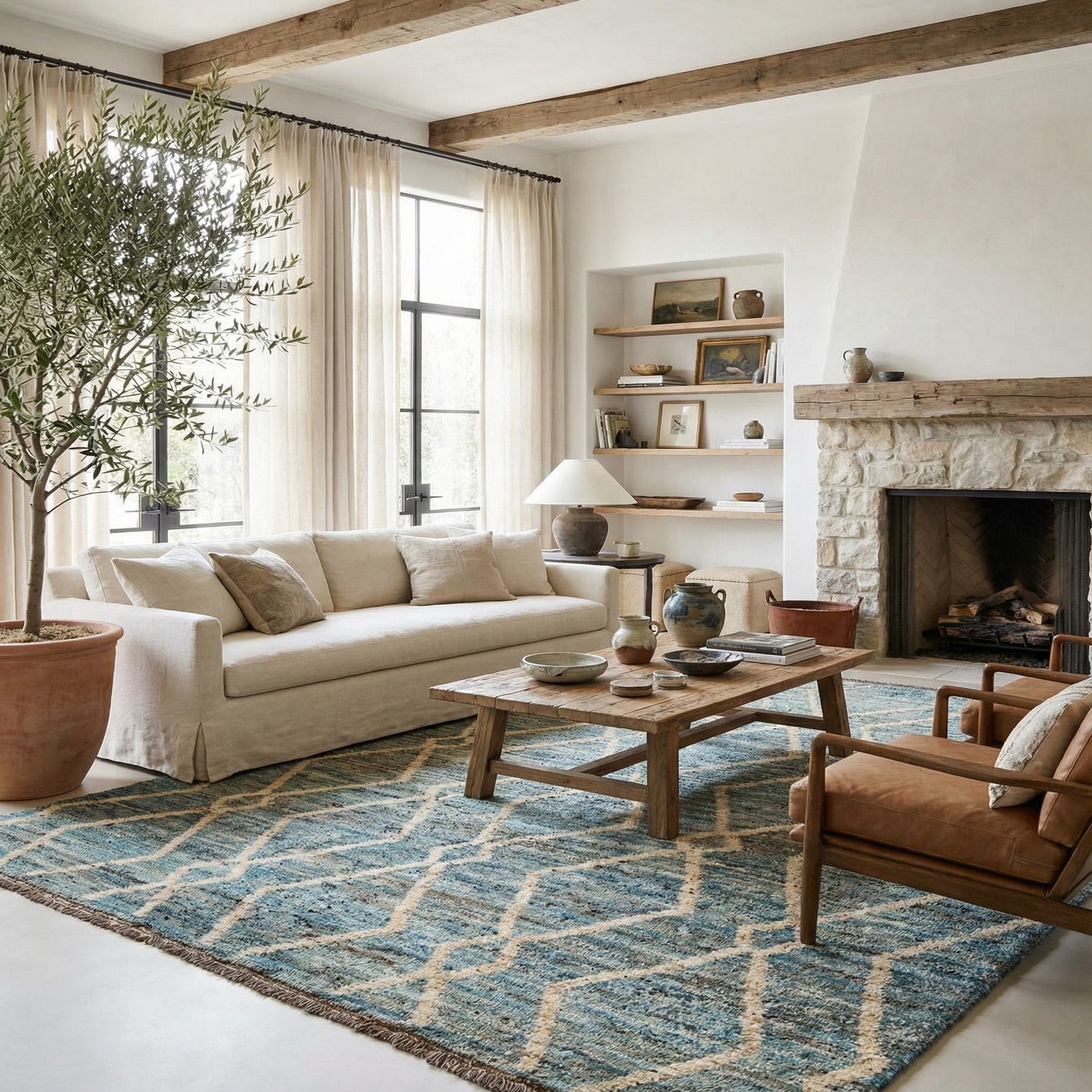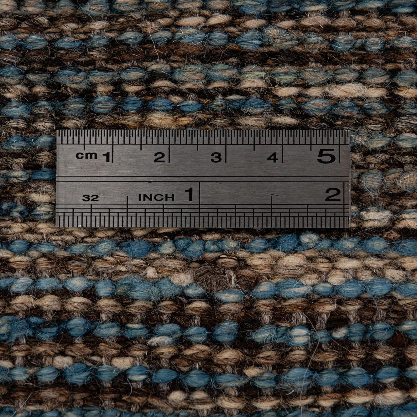 Primary color is Blue. Colors in this rug include: Blue, Brown, Cream.