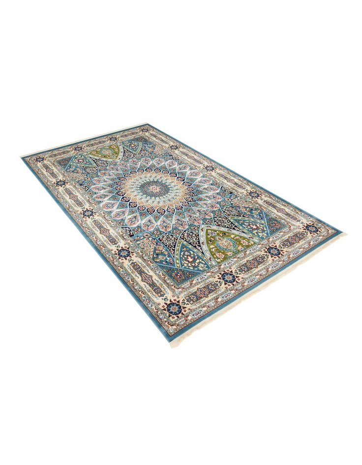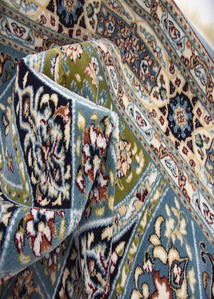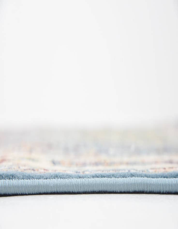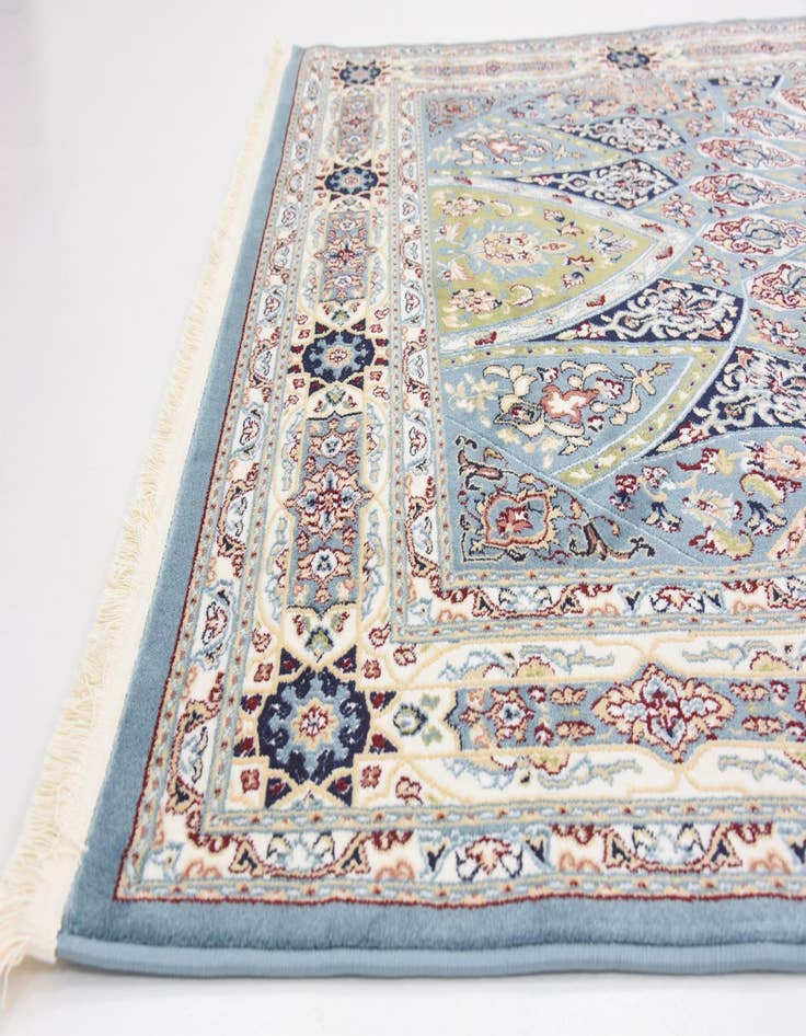 Primary color is Blue. Colors in this rug include: Blue, Burgundy, Cream, Ivory, Light Blue, Light Green, Navy Blue, Puce.
